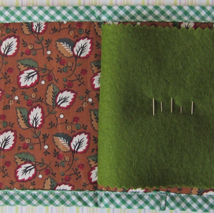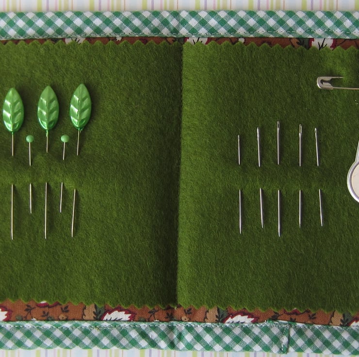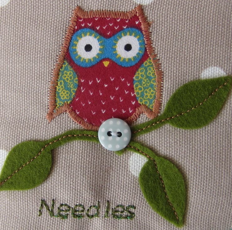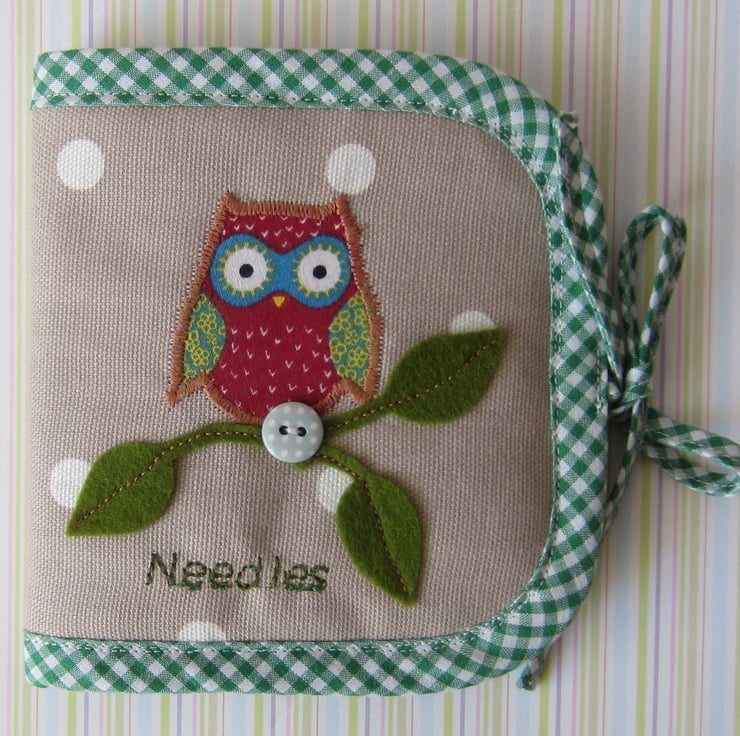 Lightly padded taupe and white spot needle case decorated with an appliqued owl and felt leaves with a spotty button. Edged with green gingham and backed with a brown leaf fabric. Inside there is a dark green felt page complete with pins, needles and a threader.