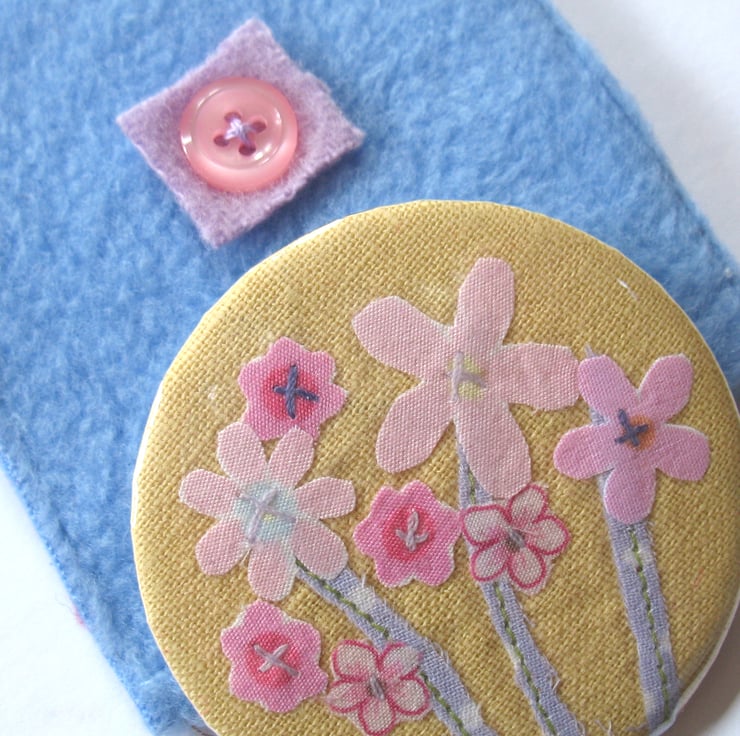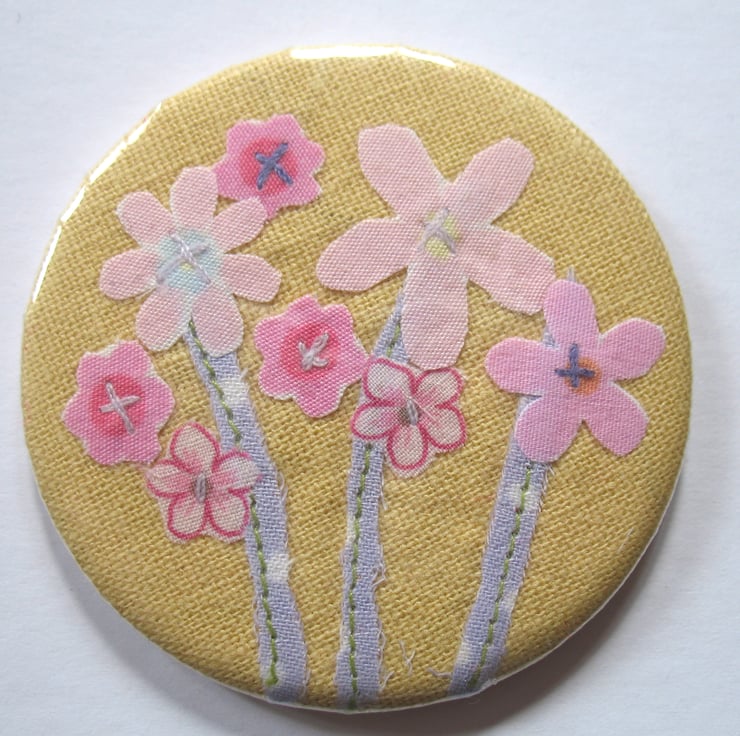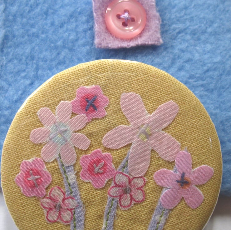 The 'Flowers' design has been individually hand cut and stitched from cotton fabrics onto a linen background and a clear protective backing added so it can be wiped clean. The metal rimmed mirror measures 58mm diameter and comes with its own protective pouch with button detail. (as shown)
