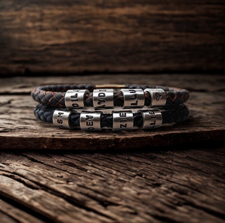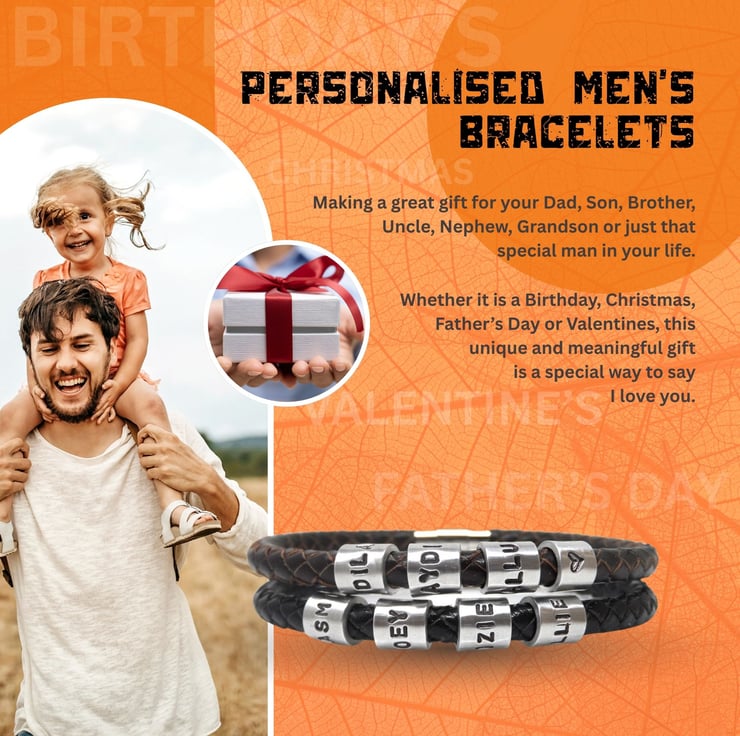 The Four ring Men's Personalised bracelet is made with genuine braided leather that is 6 mm in diameter and has a locking stainless steel connector that ensures that it will not come undone.