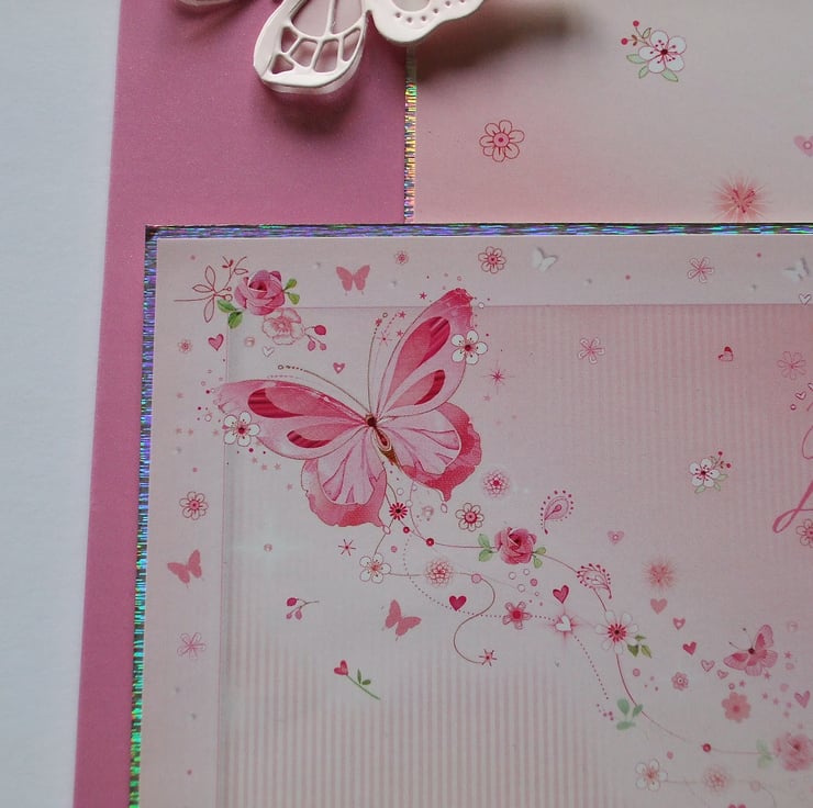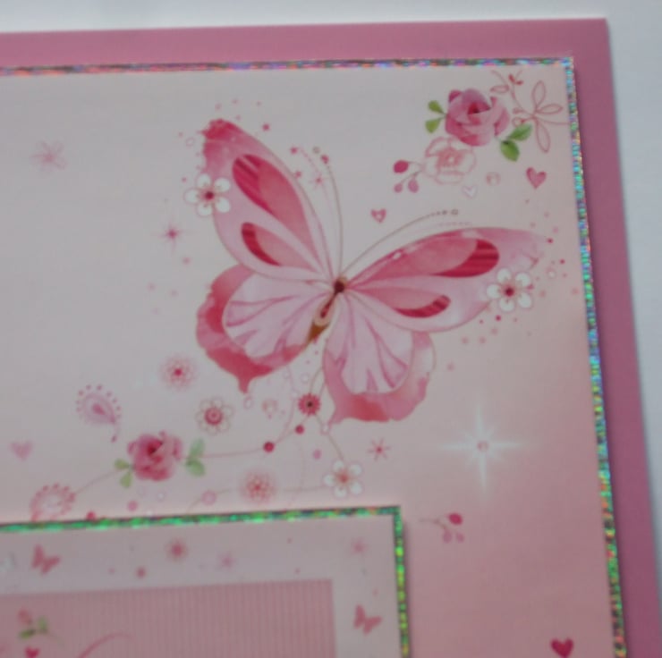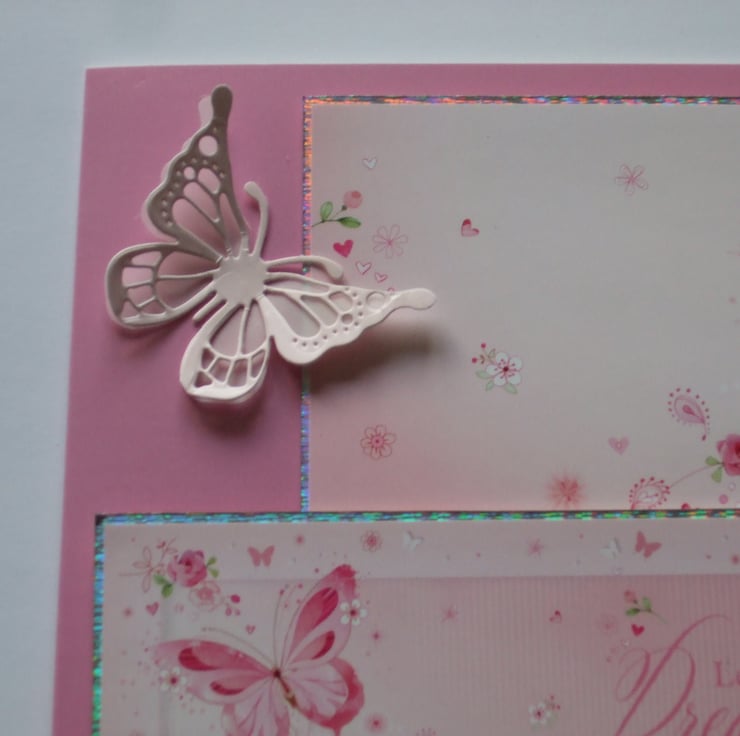 I have made the card blank using white card for the back, the front is pink with a pearly finish. The two toppers have been layered onto silver foiled card with a holographic finish before being placed onto the card overlapping across the middle. I've added a double layered die cut butterfly that has solid vellum wings on the bottom and filigree wings cut from pale pink card on the top, both layers have been glued only on the body so the wings can be lifted to give a 3D element to the card.