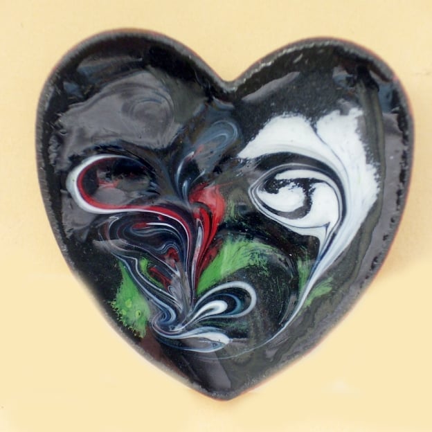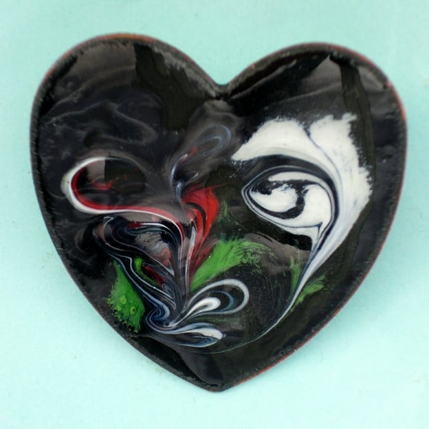 On a black enamel background I have made the scrolled design in red, green and white by drawing a steel tip through the enamel while it was at red hot. This generates a random pattern with some texture where the enamel has set smooth but uneven around places where the tool has disturbed it. This adds to the light effects that the enamel gives.