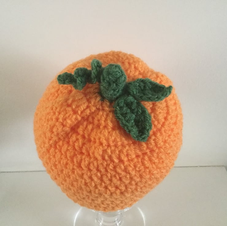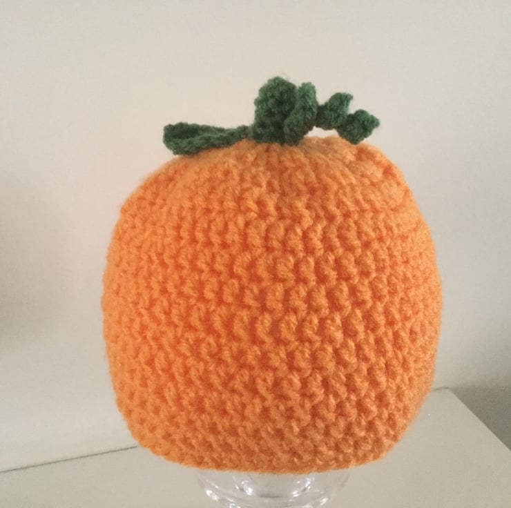 I have crocheted this sweet little pumpkin hat in bright orange and green acrylic yarn. It is decorated with leaves and corkscrew tendrils. Great for Halloween or photo prop.