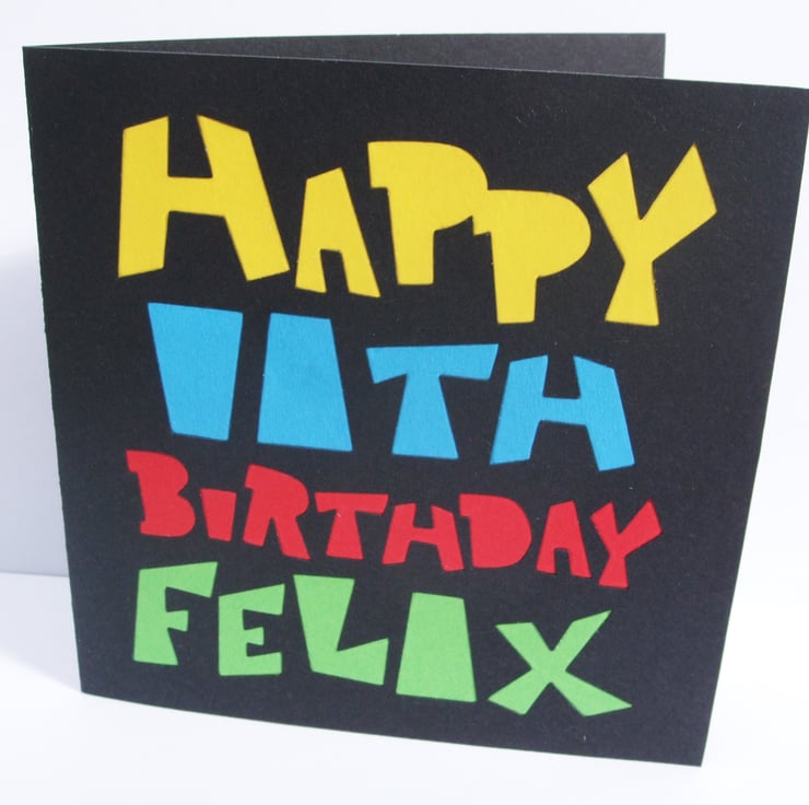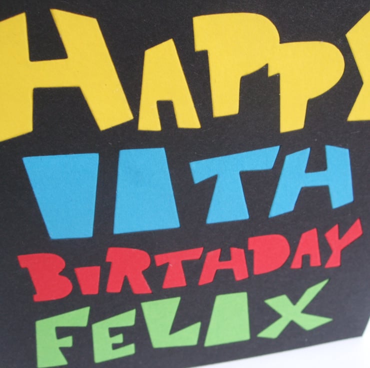 This fun and colourful card makes the perfect personalised birthday card for a child or an adult with it's funky brightly coloured paper cut message. The letters are paper cut and then coloured card has been stuck behind. The letters are then embossed so they they are flush with the card.