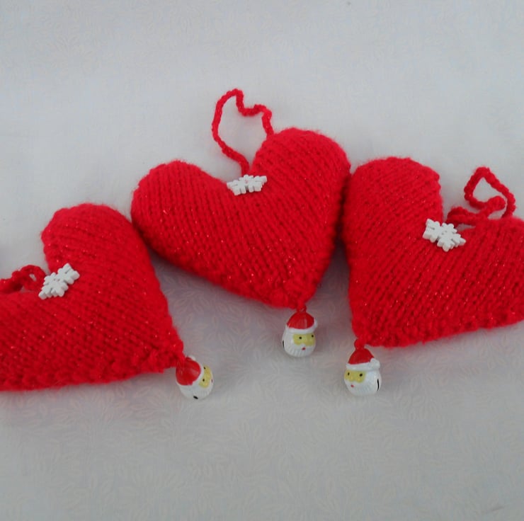A trio of hand knitted red sparkle Christmas hearts. Each heart is decorated with a white wood star button and a Father Christmas metal jingle bell which hands from the bottom of the heart. A long red crochet hanging loop is attached to the top of the heart.