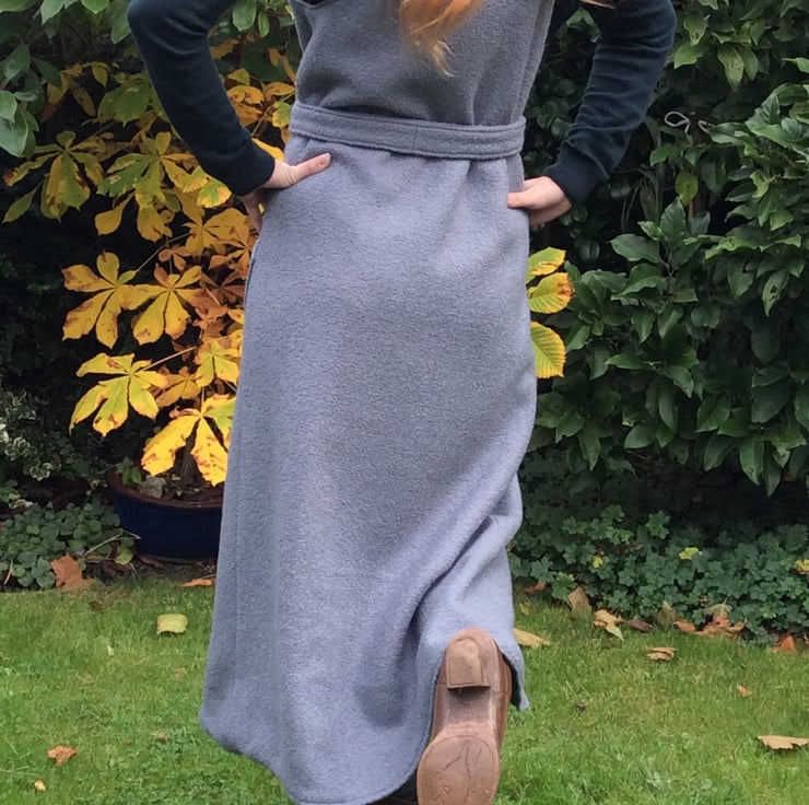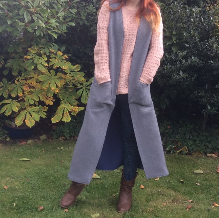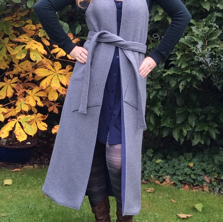 This on trend, longline sleeveless, edge to edge coat is one of a kind and would be unique to you. It has simple elegant lines and is made from an attractive, heavyweight, grey woollen, textured fabric. The coat has a petrol blue lining, two patch pockets and a matching, optional tie belt. It has generous arm holes to allow for layering cosy knitwear underneath.