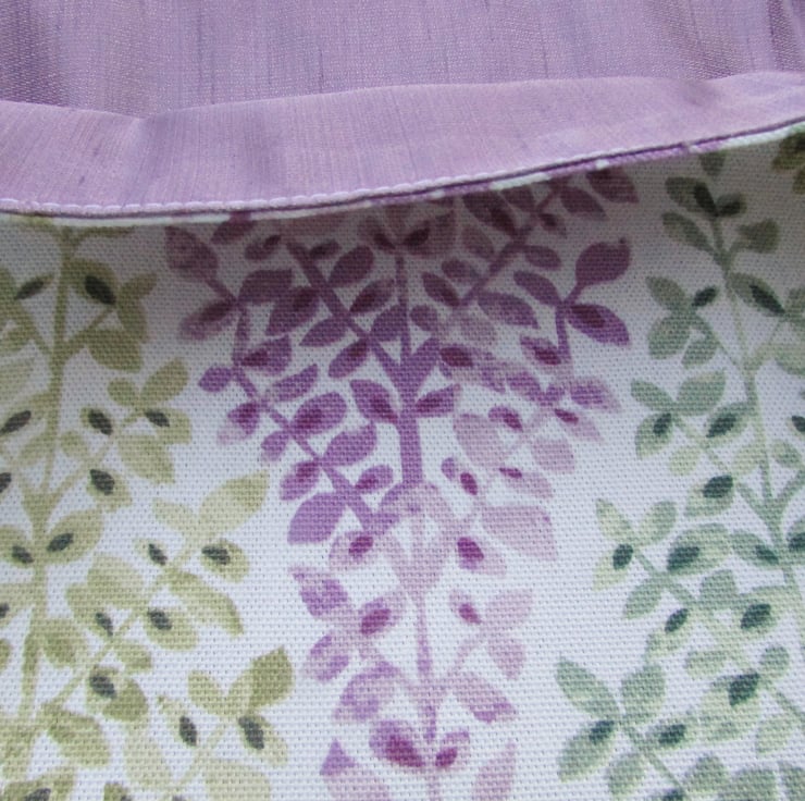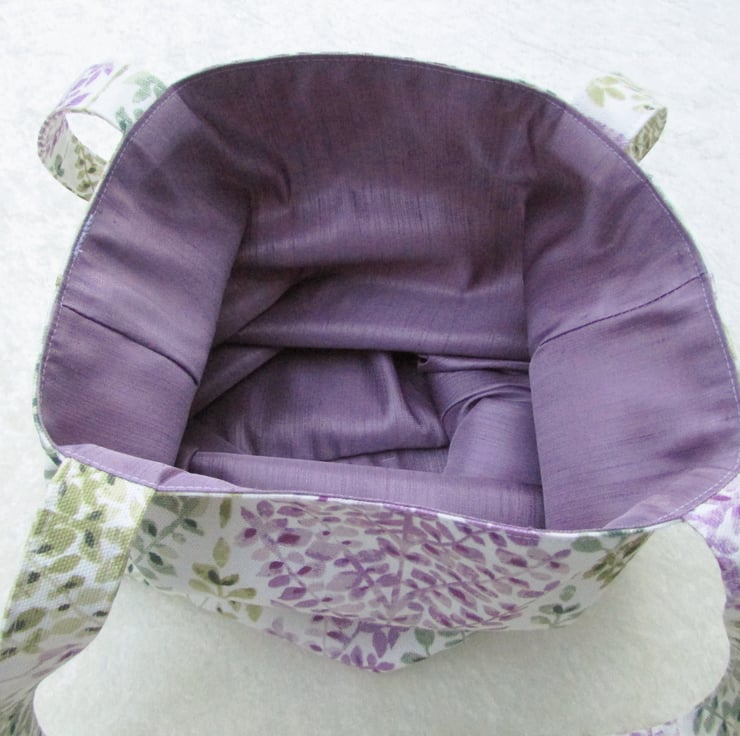 A pretty tote bag in an unusual print fabric of mauve, sage green and blue-green leafy trees in a diamond pattern on a white background. The bag is lined with a lovely mauve satin-finish fabric which complements the outer fabric perfectly.