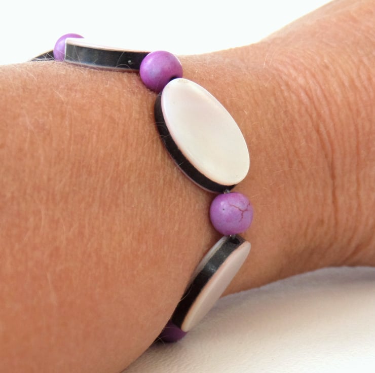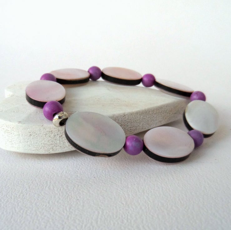 I have threaded pretty oval shells beads with small pink / purple gemstones on jewellery elastic to make this pretty bracelet.