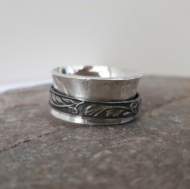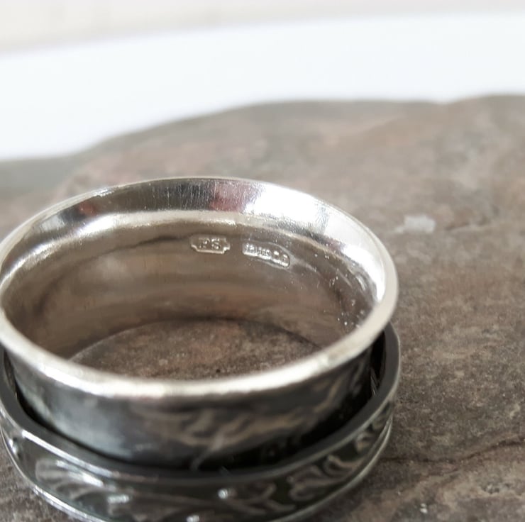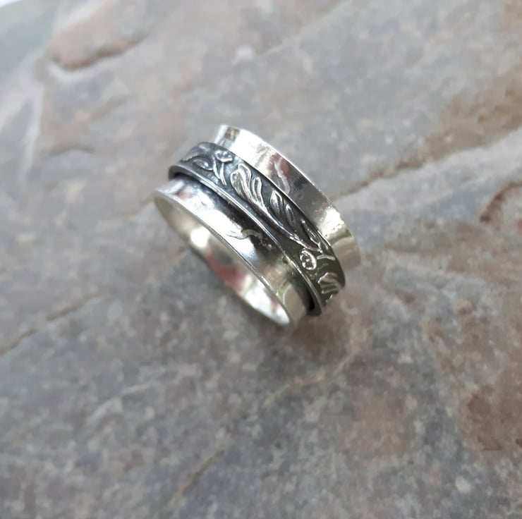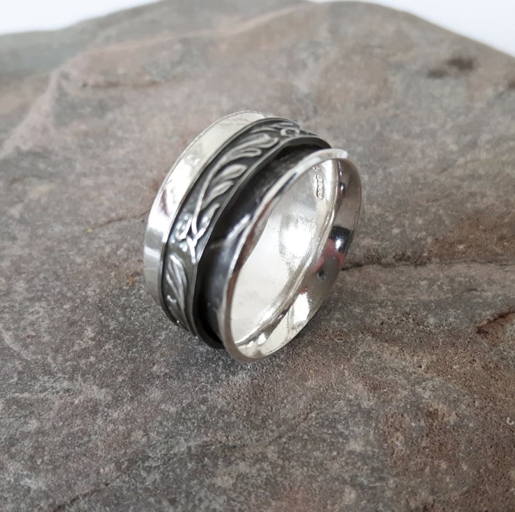 This sterling silver spinner ring would make an ideal gift for the fidget in your family! A spinning ring helps to relieve stress and calm the nerves. The inner ring is 10mm wide, anticlastic in shape with its edges slightly flared to hold the spinner in place. It has been hand-textured with lace and polished to a bright shine. The single spinner is made from a leaf-patterned wire, 4.1mm wide, which has been oxidised to create a darker antique-style patina in the crevices while the high spots remain bright. I have used Renaissance wax to protect the patina but it may lighten with wear, especially if treated with silver polish. Traditional silver hallmarks, with my own maker's mark, have beeen applied by the London Assay Office. The actual UK size of the ring is close to N, but you should buy a wide ring like this in a larger size than usual so if you normally wear size L or M this should fit you.