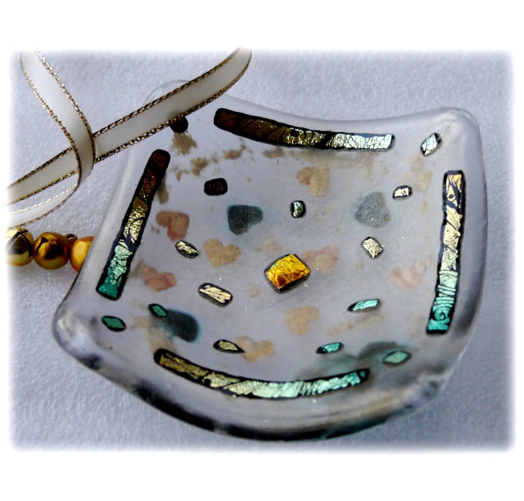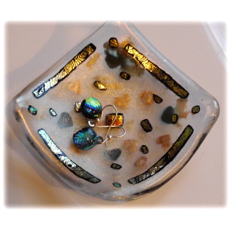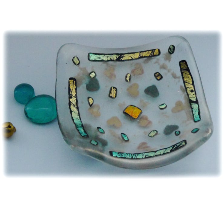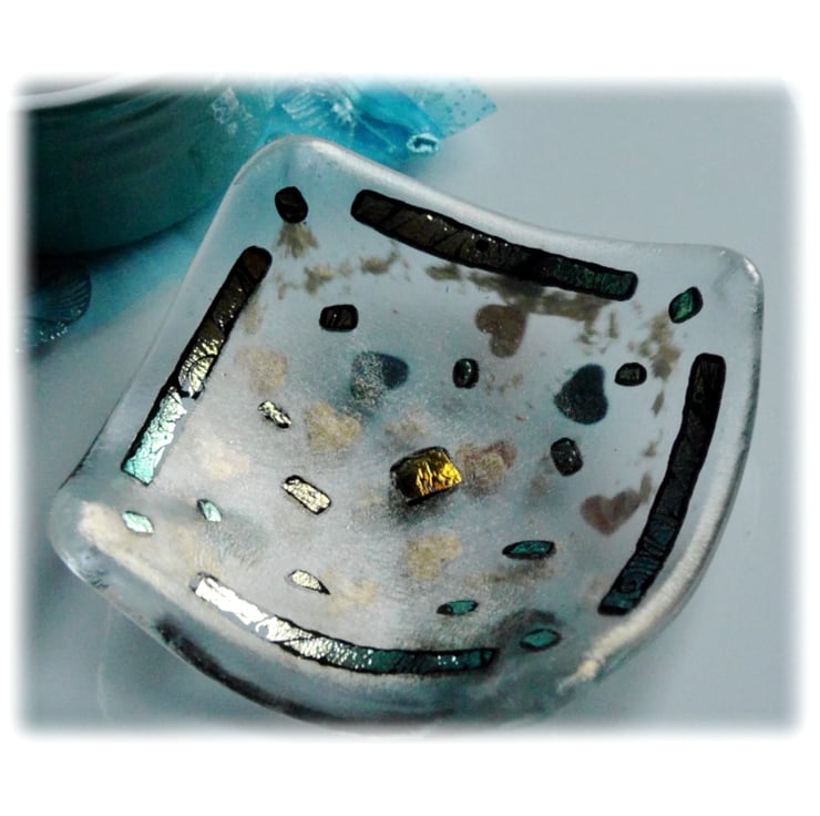 This square dish is on a base of clear glass with a top layer of gold iridescent glass. Between the two layers I've trapped some gold hearts and some entirely random gold glitter. The top is decorated with precious dichroic glass. A rather lovely etched variety, gold on black which surprisingly shines turquoise in the light.