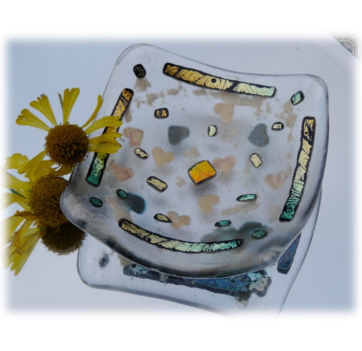 A 9cm square dish, twice fired in my kiln, first to fuse all the glass together, 2nd to slump it over a little mould into a shallow dish shape.