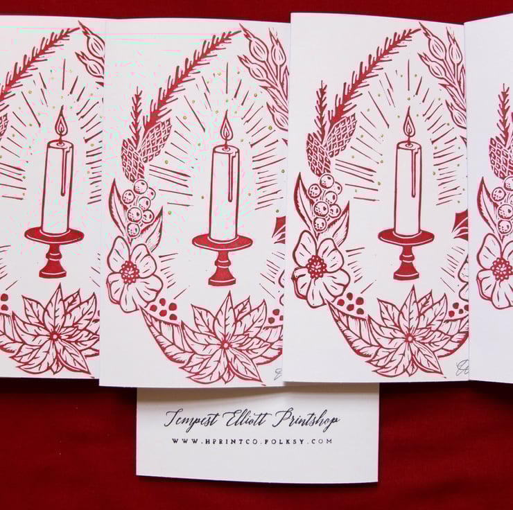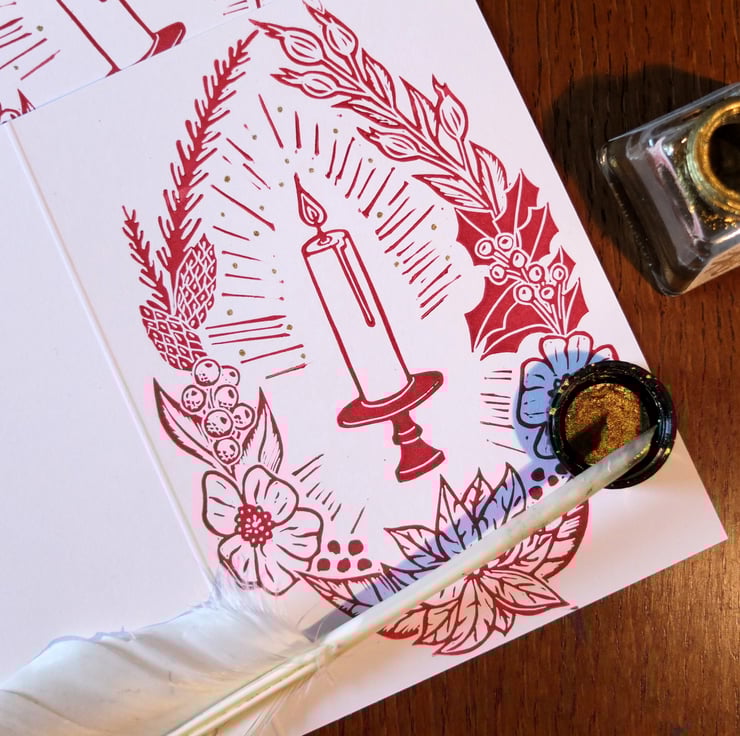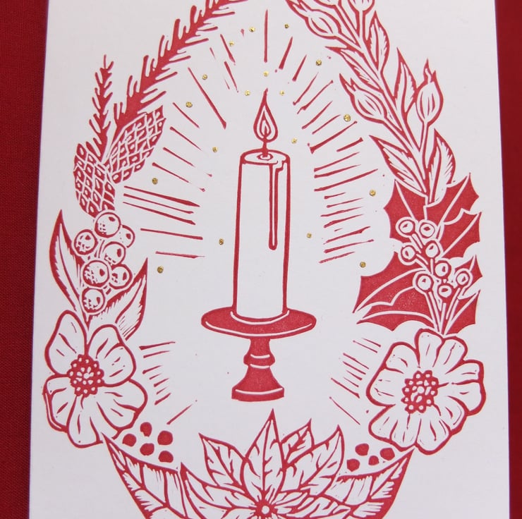 This listing is for a pack of 4 hand printed Christmas cards, made from a linocut. Available in a deep rich red and I've used a feather quill to hand paint dots of gold ink radiating from the candle. These really shimmer in the light! The wreath is made up of snowberries, holly, rosehips, poinsettia and pine.