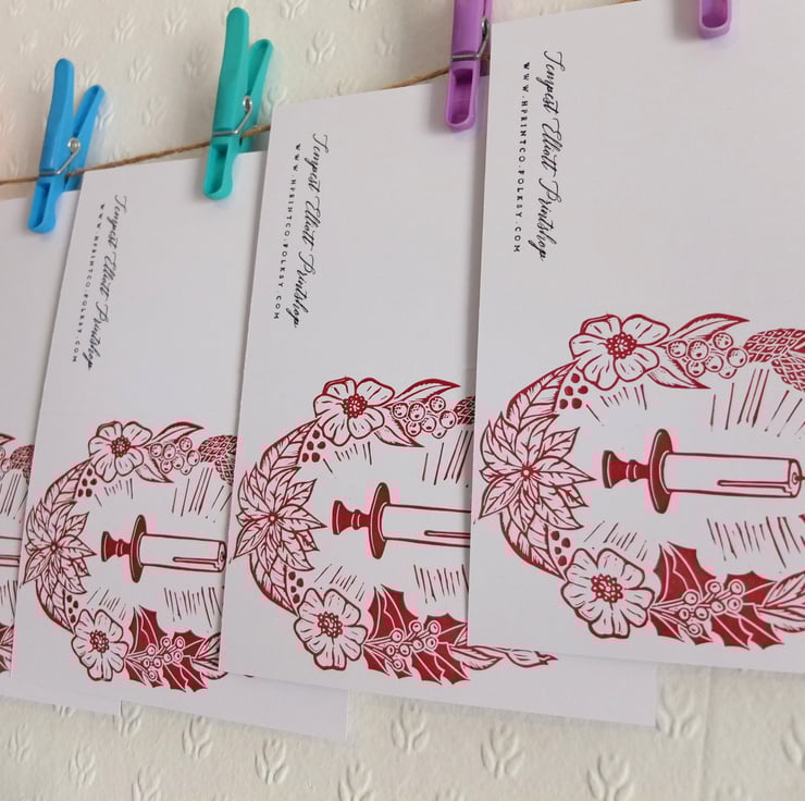 Each card is printed by hand using a traditional printing press, one at a time. They are all signed in pencil and have my maker's stamp on the reverse. Please note due to the handmade nature of these prints, there may be slight variations between them but this makes every one unique!