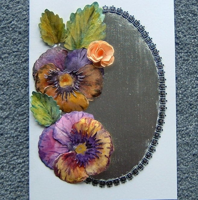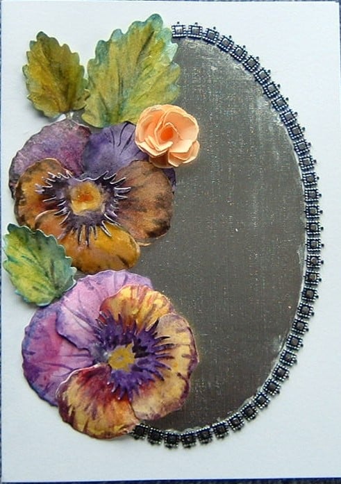 The flowers were die cut but then completely hand painted in watercolour paints. (no rubber stamps were used). I then added a hand crafted peach flower. before assembling the card.