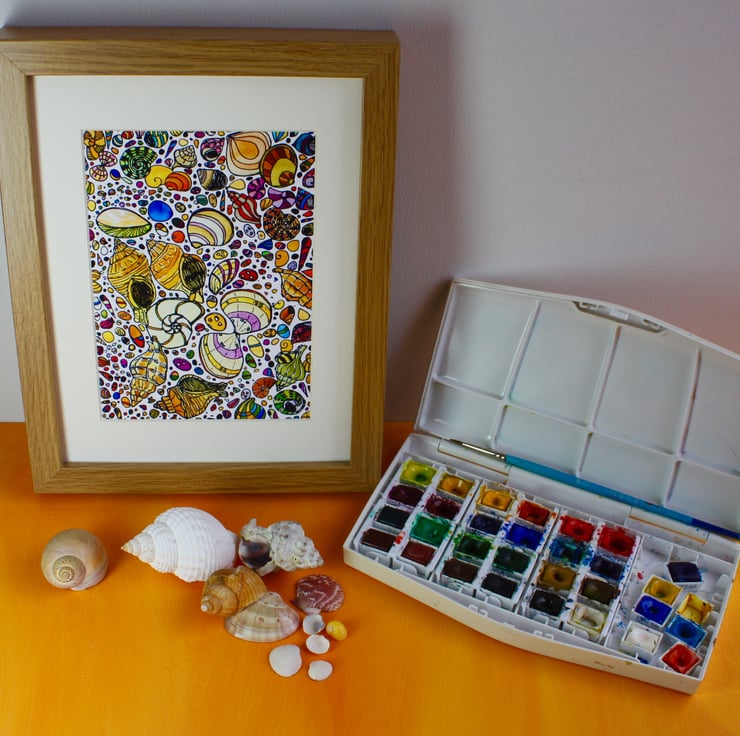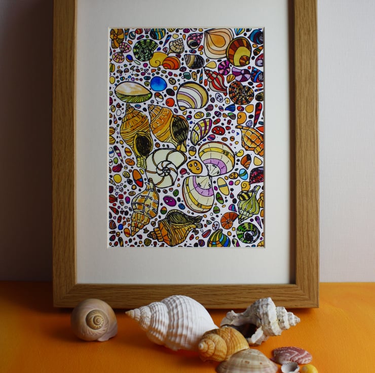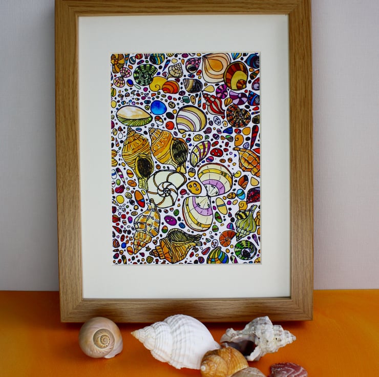 This beautiful pen and watercolour sketch of the shells on the beach has been giclee printed on 308gsm archive quality Hahnemule Photo Rag paper.