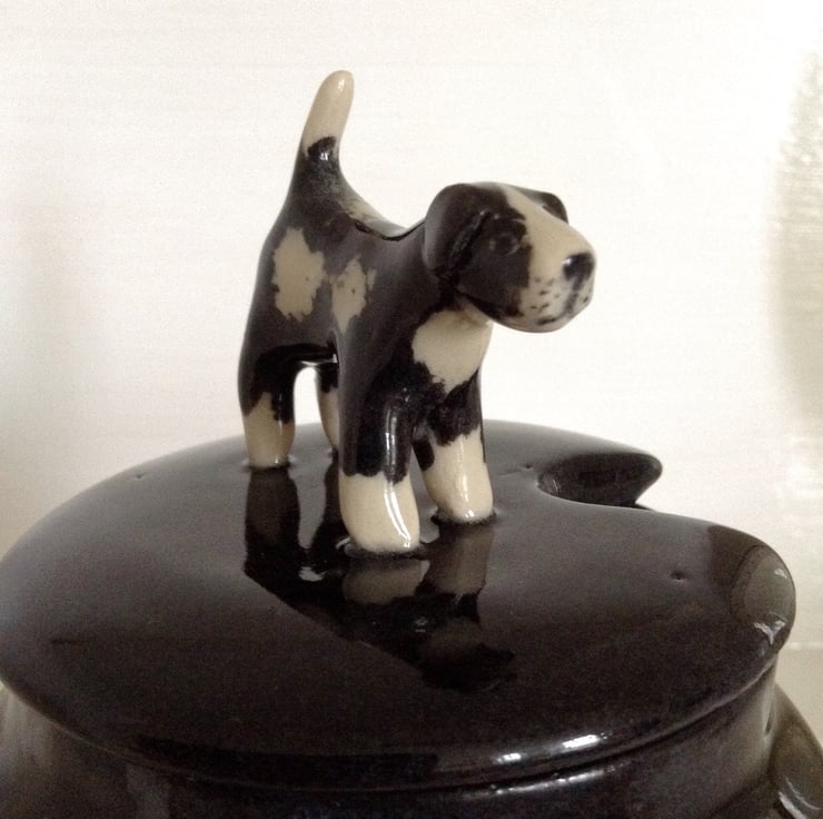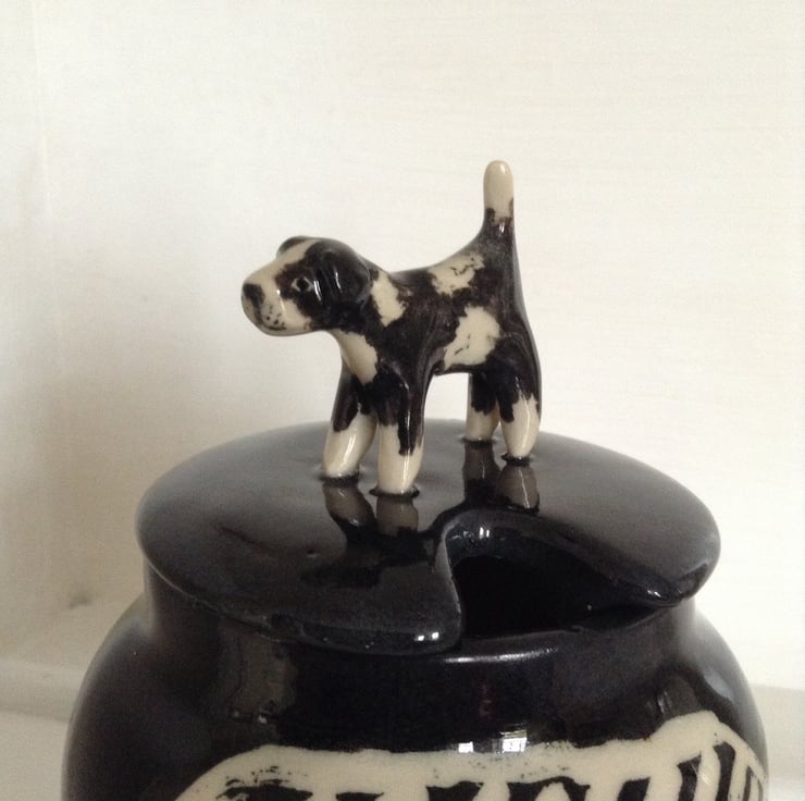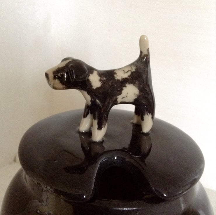 Charming hand thrown stoneware lidded jar for jam, honey, sugar etc. The lid has a space for a spoon and is topped by a little black and white dog. A lovely decorative piece, which is also eminently useful.