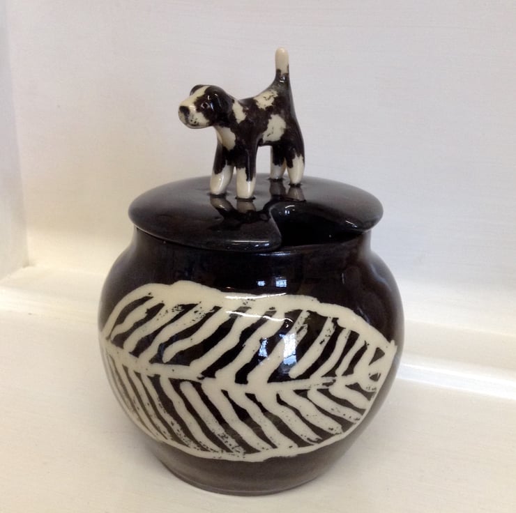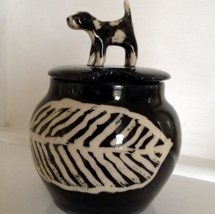 The decoration on this pot is inspired by a wonderful cave painting of a leaf which I saw at Uluru in Australia. Stunning in its simplicity and thousands of years old, I fell in love with it and it crops up on quite a few of my pots. I love dogs too, so this pot is a homage to both!