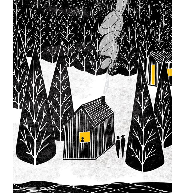 A bold graphic art print of a warm homely cabin within a wintery forest setting which would make a perfect gift for family and friends.
