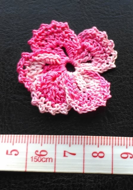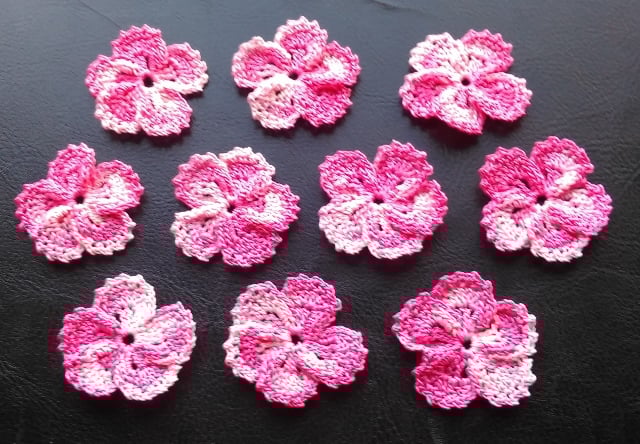 Pack of 10 - five petal flowers in pink, muticoloured, 100% cotton thread