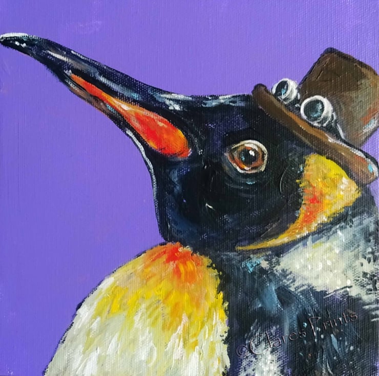 Original acrylic painting on canvas of a very dapper Steampunk King Penguin in his brown top hat and goggles!