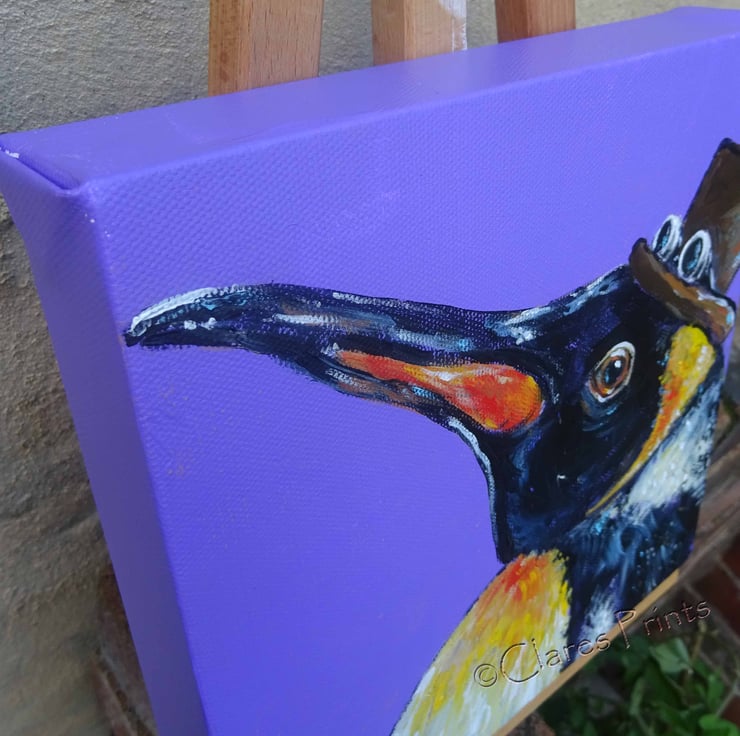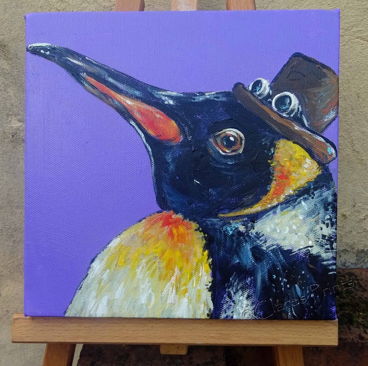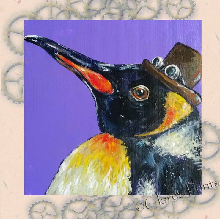 Original acrylic painting on canvas of a very dapper Steampunk King Penguin in his brown top hat and goggles!