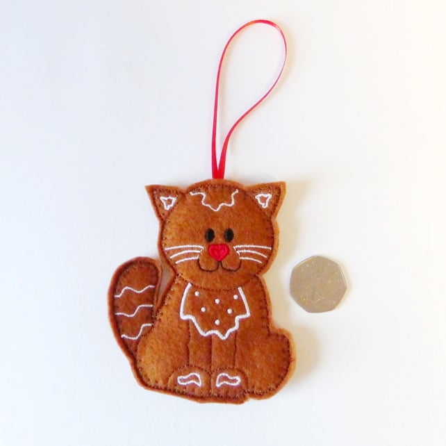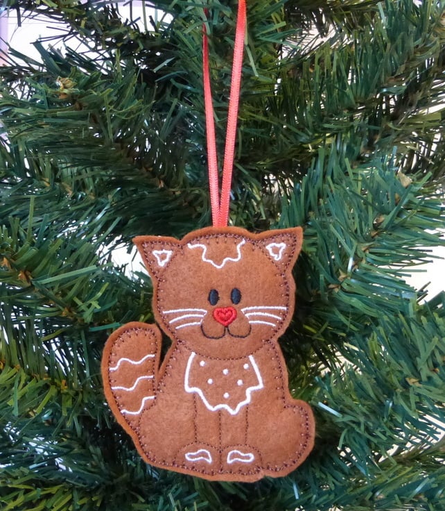 1 gingerbread cat Christmas decoration made from felt in a gingery brown colour.