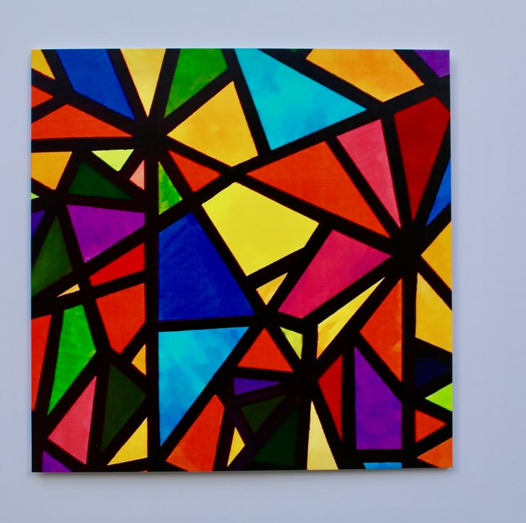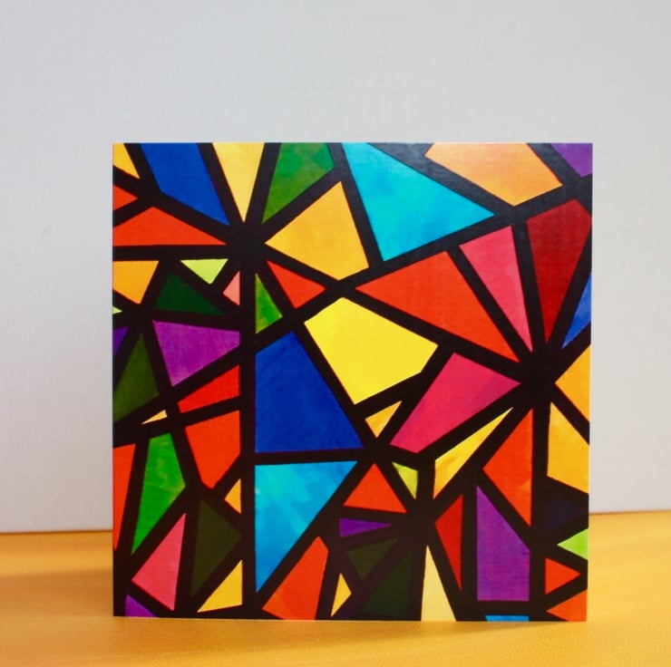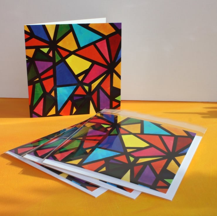 The picture almost looks like stained glass but is an acrylic painting on canvas. It has been reproduced on high quality recycled card and measures 12.5cm square. Supplied with a white envelope individually wrapped in a cello packet ready for you to send to someone to brighten their day.