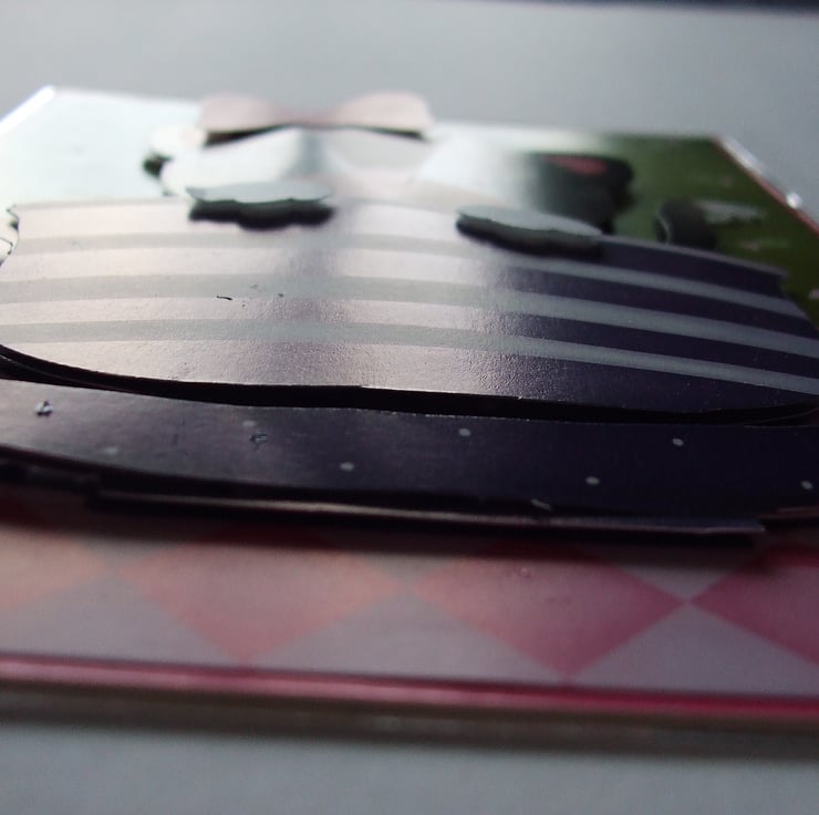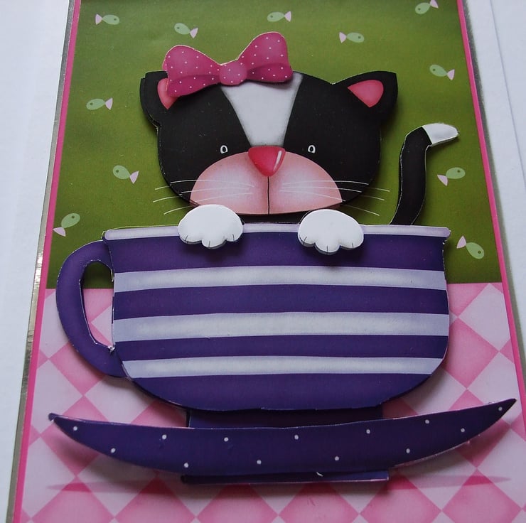 The base layer of decoupage has been layered onto bright pink and silver cardstock to frame it before being placed onto a white card. I've hand cut different elements from several other copies of the Kitten picture and stacked them with 3D glue to add depth to the image.