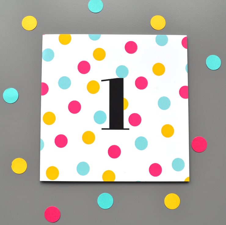 FREE UK POSTAGE! Kid's age birthday card with a dotty pattern in deep pink, aqua and yellow on a crisp white background. Age in black text in the centre of the card.