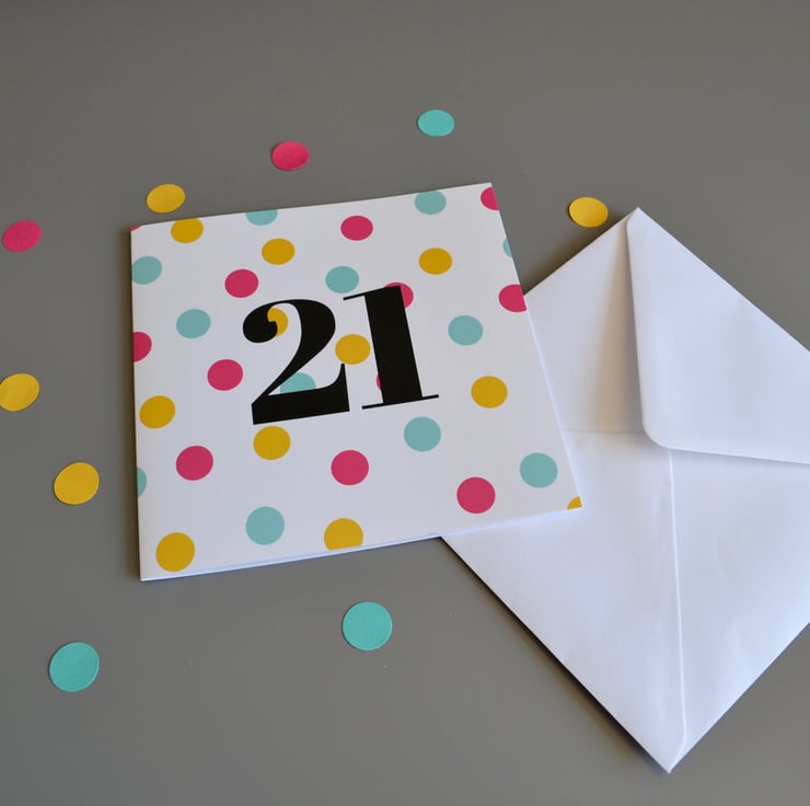 9th birthday card in a crisp, simple graphic design. Kid's age birthday card with a dotty pattern in deep pink, aqua and yellow on a crisp white background. Age in black text in the centre of the card.