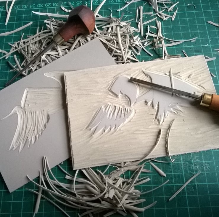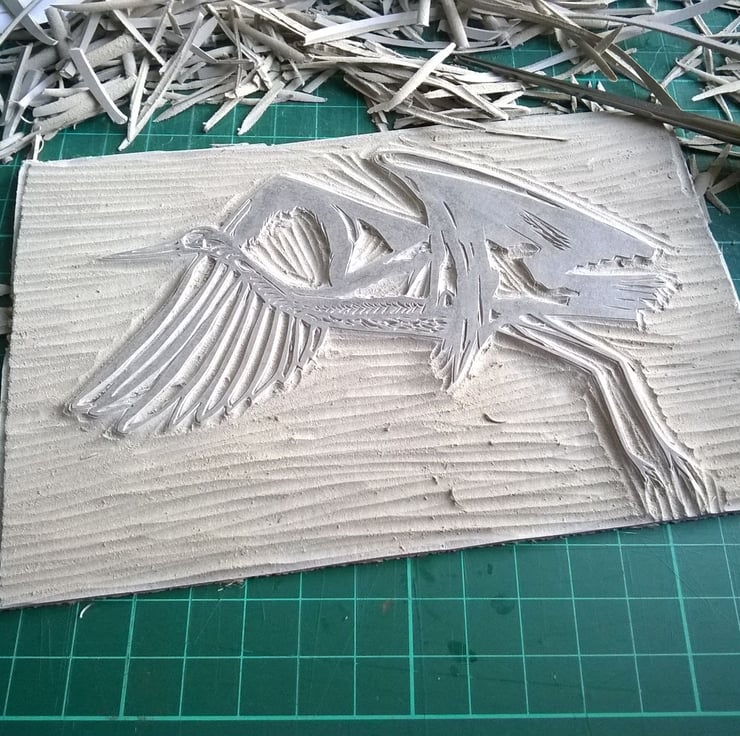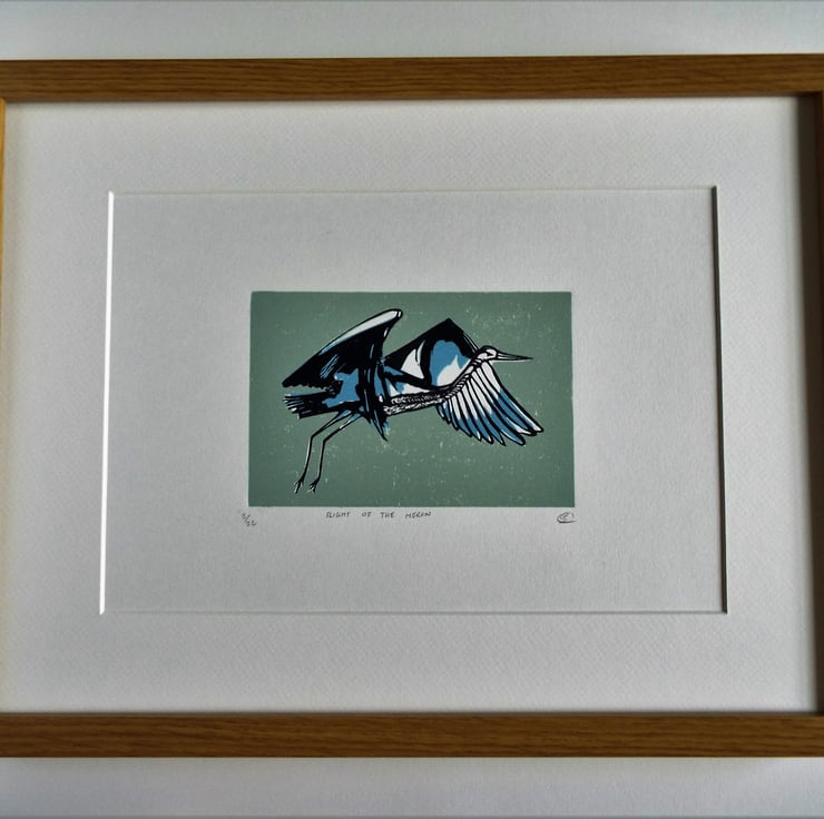 This is a three colour lino print from an edition of 22. Made using Caligo Safe wash oil ink on 220 gsm acid free paper.