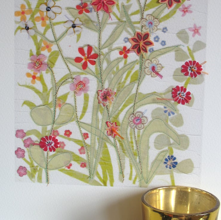 Hand cut flowers have been stitched onto the print for added colour and texture, with golden machine stitched details this print is one of a kind!