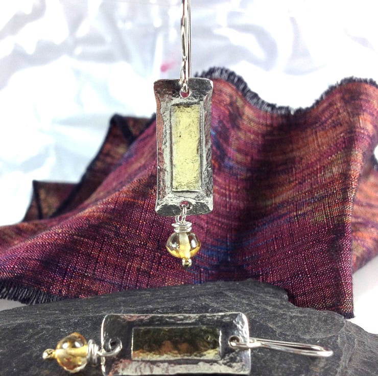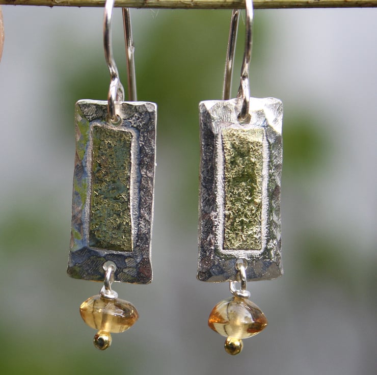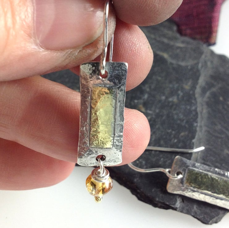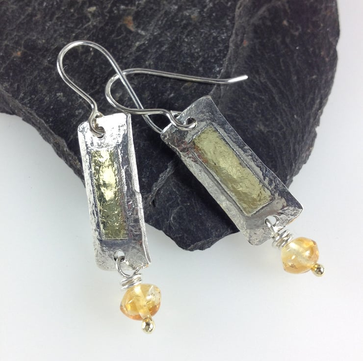 Rectangles of fused silver and gold have been beaten for texture and hung from handmade hook earwires. Small handcut citrine beads dangle from the bottoms.