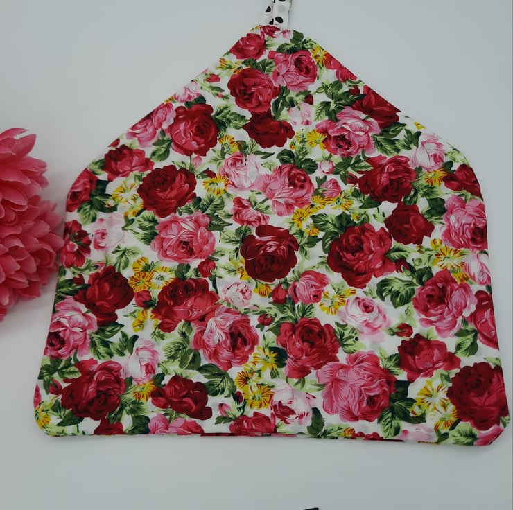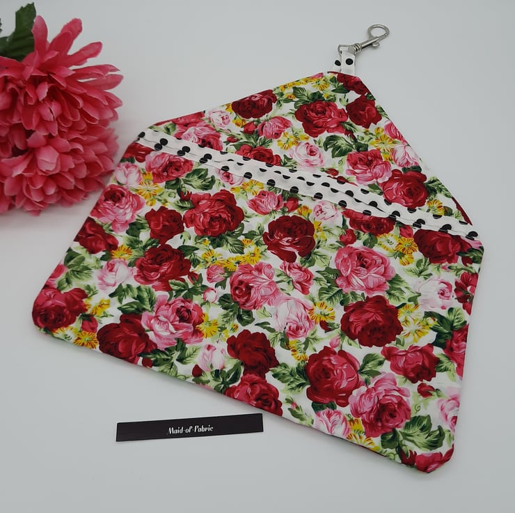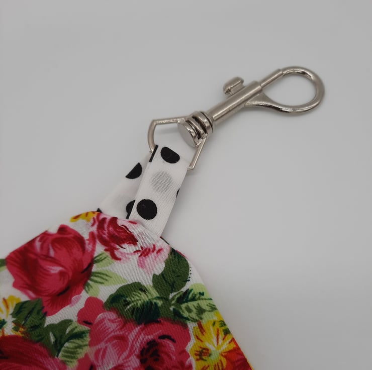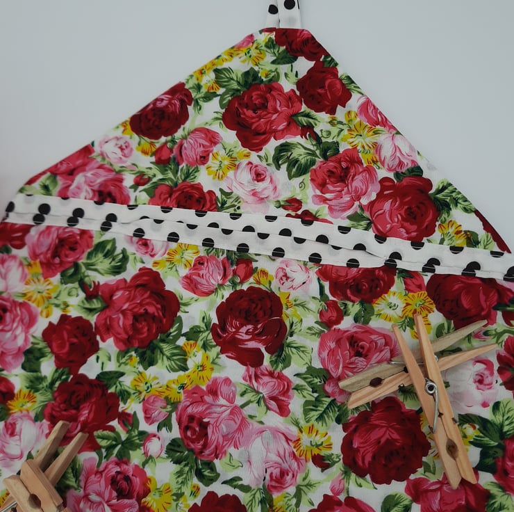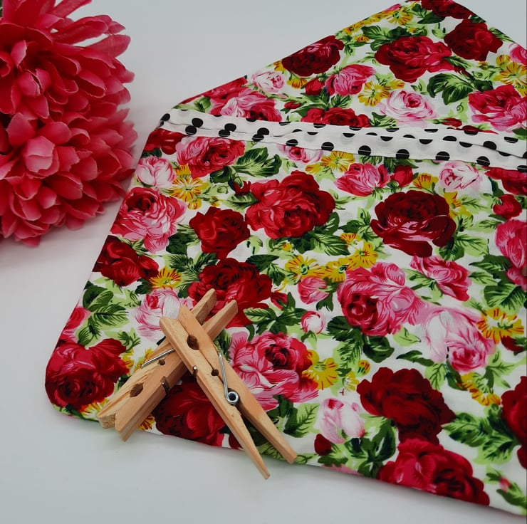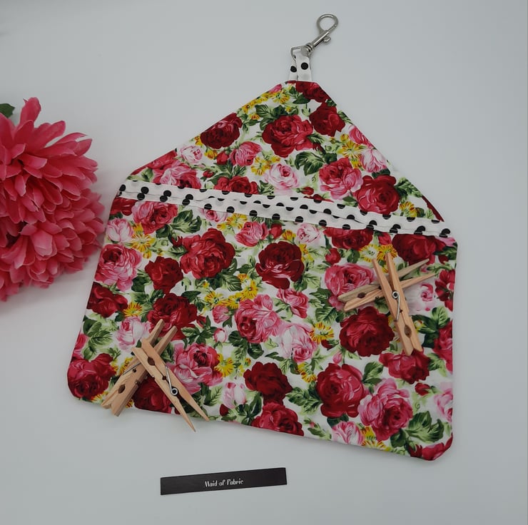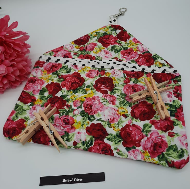 Peg bag made using this beautiful soft pink floral cotton fabric. Lined with white and black polkadot cotton.