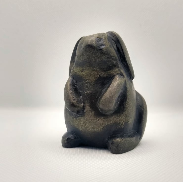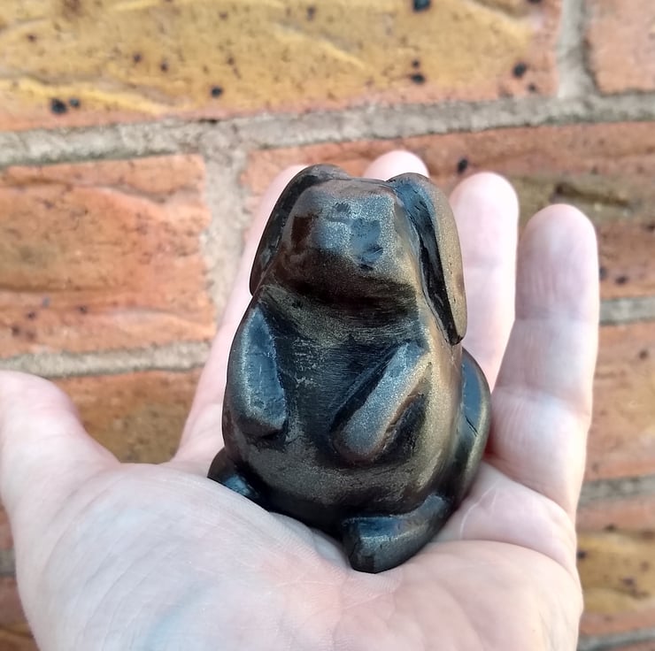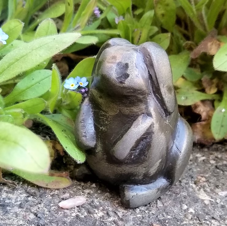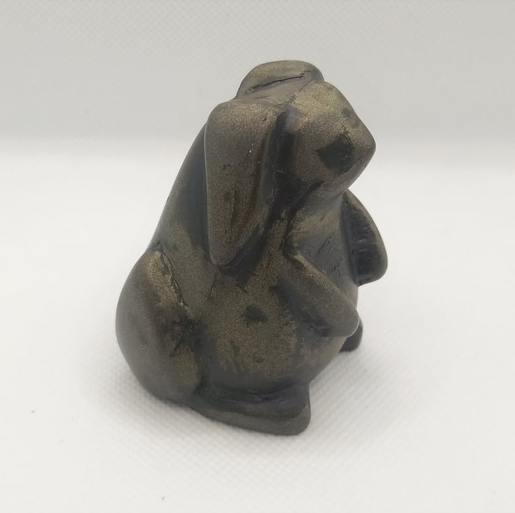 This Rabbit figure is made using the cold casting method of casting. Bronze metal powder is added to resin. Heavy for its size this piece will patina and age over time, especially if kept outdoors (This Rabbit is also house trained and can be placed inside). If needed a quick wipe with a metal polishing cloth is all that is required. A light grazing with some fine wire wool is also good.