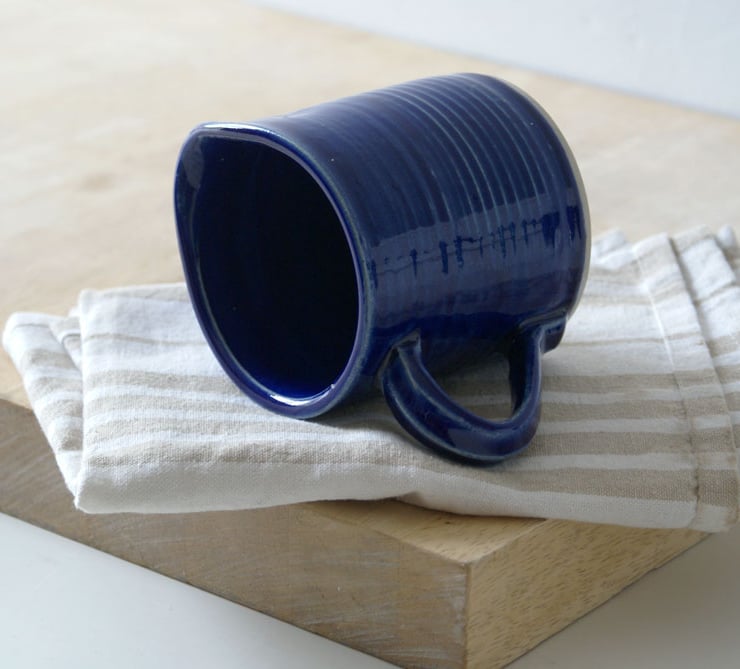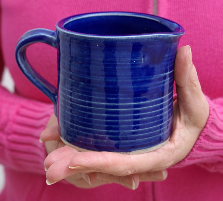 Hand thrown on my potters wheel this little creamer features straight sides, a sturdy pulled handle and a channeled pouring lip to provide a steady flow. It has a glossy finish to the touch and is glazed in ocean blue.