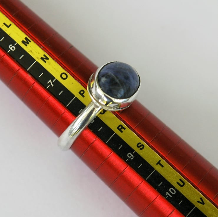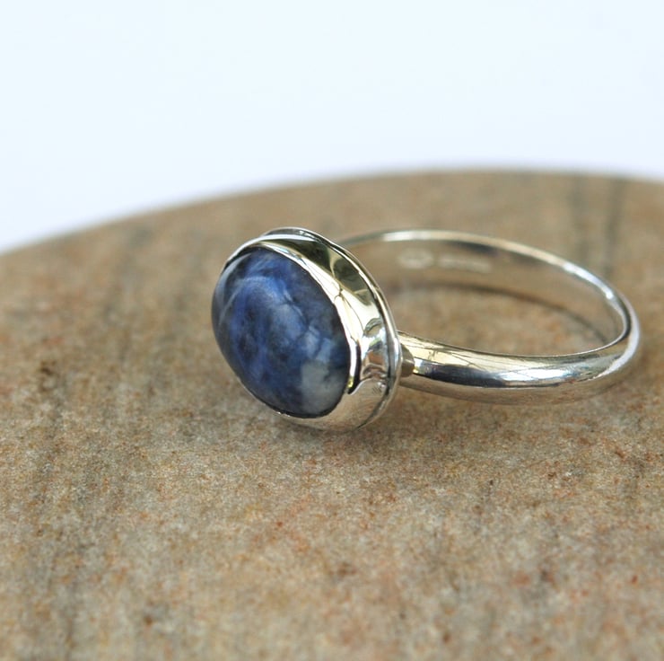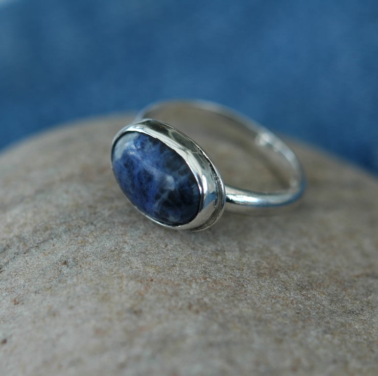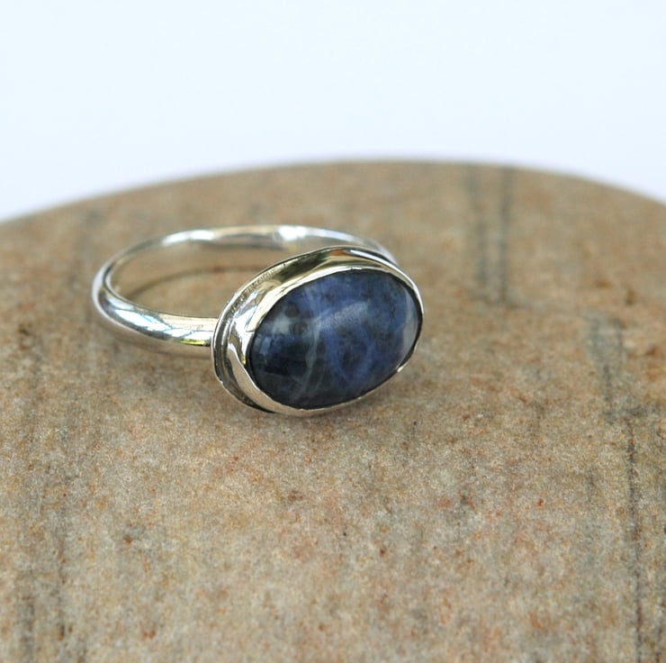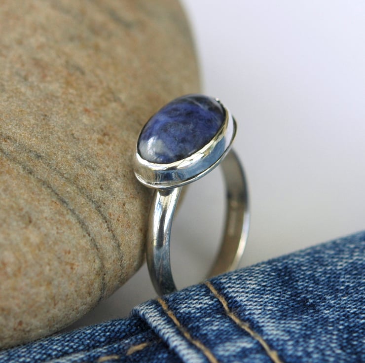 This cool sterling silver ring with blue sodalite is a real eyecatcher. It has been hand made from 3.2mm wide D-profile wire and has a large 14x10mm oval cabochon of sodalite mounted horizontally in a bezel setting so it lies across the width of the finger. The ring is UK size P and has been stamped with traditional silver hallmarks and my own maker's mark by the London Assay Office. The sodalite gemstone is a beautiful shade of indigo blue with some white veining. It looks great teamed with casual denim wear, as shown in two of the photos.The ring will be packaged in a smart gift box or organza bag and sent to you by Royal mail first class post.