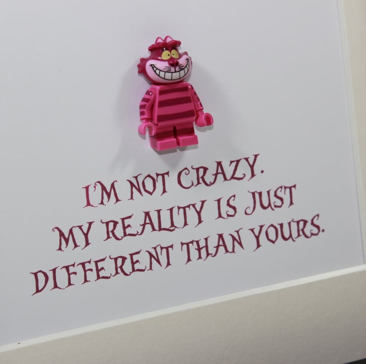 We couldn't wait to get hold of this cheeky and slightly crazy individual... From the classic Disney movie we would love you to meet the Cheshire Cat. He has been superbly recreated with his cheesy grin. We have mounted him in to a deep box frame and comes complete with the classic quote "I'm not crazy. My reality is different than yours."