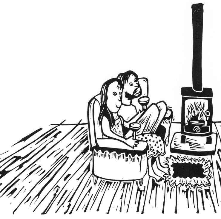 A couple sitting cosily on the sofa in front of their wood burning stove, something tasty in a glass in their hands...