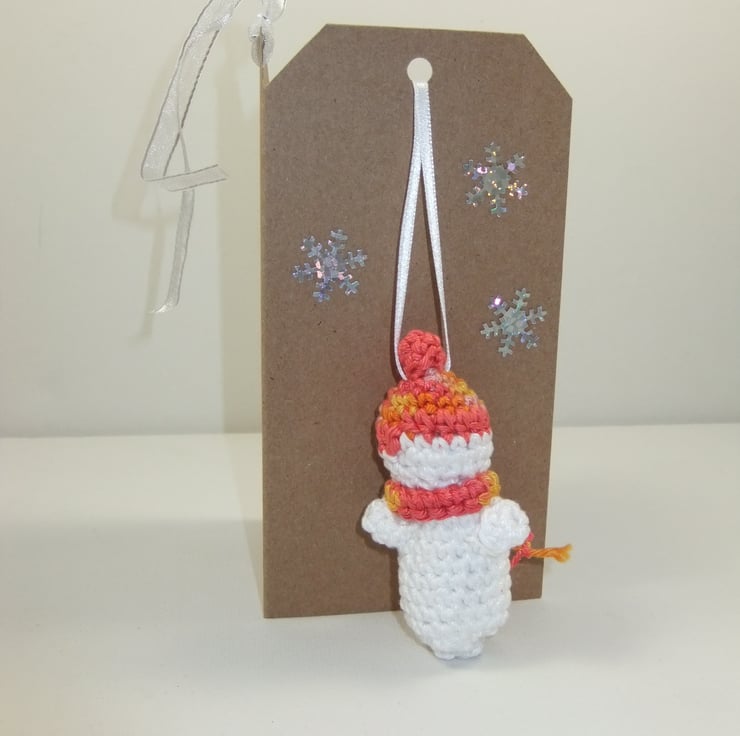 A pretty card this year and a lovely tree decoration for many a year to come! The little snowman on the front of this keepsake card is crocheted in 100% cotton from a pattern by Janine Holmes. It is approximately 8 cm tall from the bobble on its hat to the base and it has little black beads for eyes and buttons. The front of the tag-shaped card is further decorated with shimmering silver snowflakes and the inside is left blank for your own message.