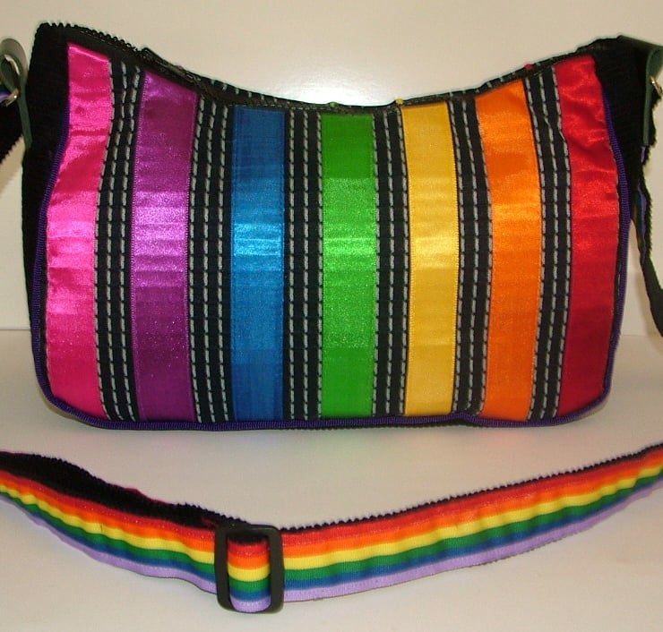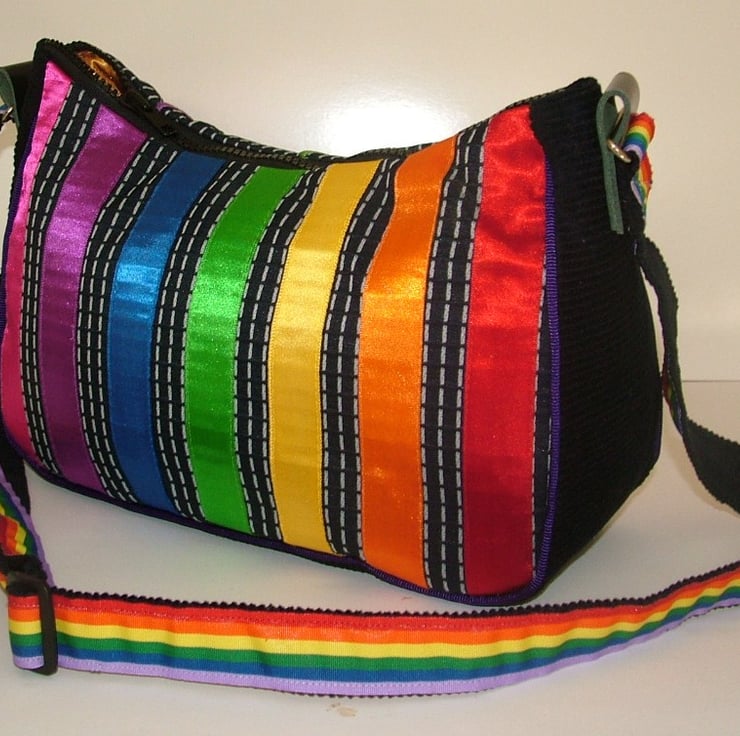 The long adjustable rainbow shoulder strap is attached to the bag with two leather straps and 2 metal rings