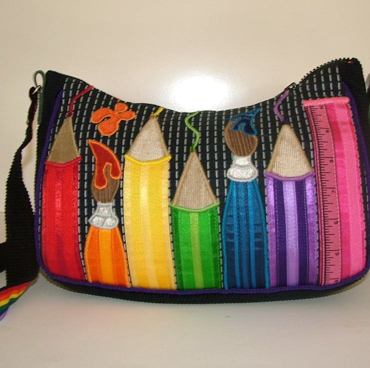 The front is made from navy dashed woven fabric laid with 7 different coloured ribbons (3 different size ribbons on each pencil) to produce a multi coloured pencils, paintbrushes and a ruler, each pencil has been hand beaded to give the pencil leads an extra sparkle.