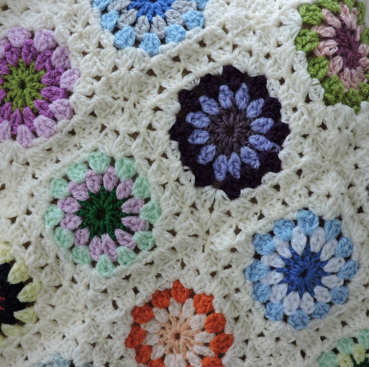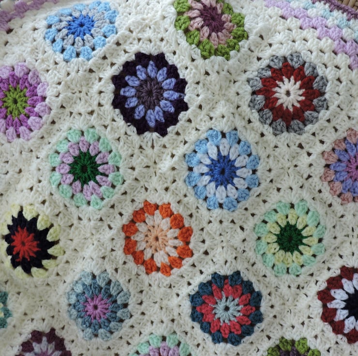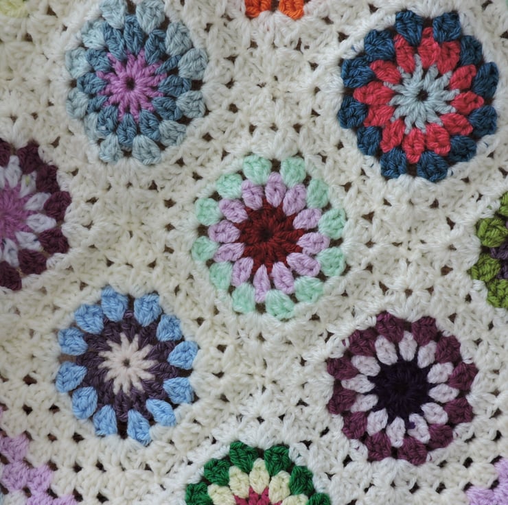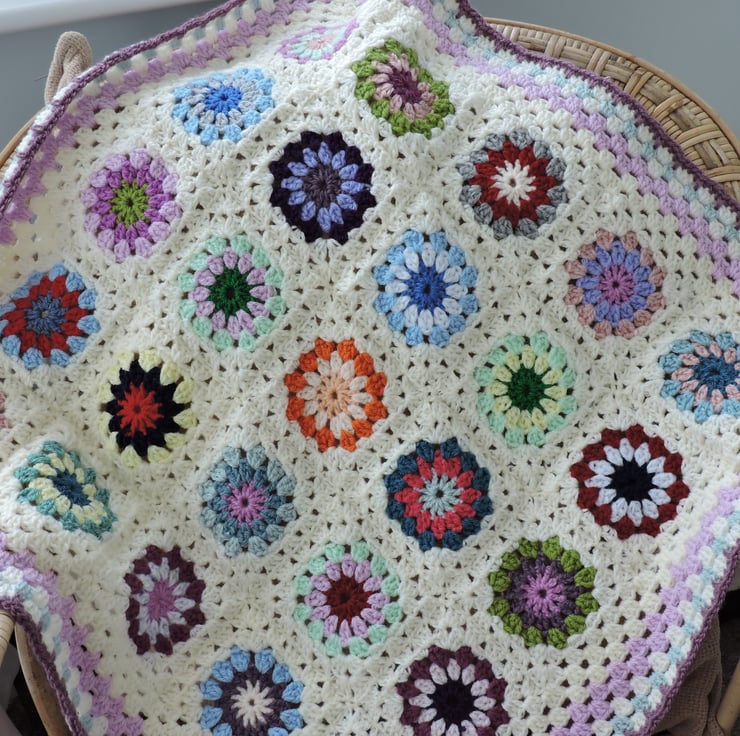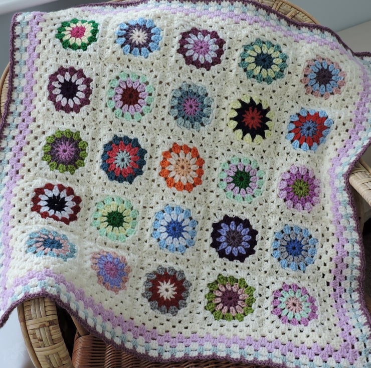 This colourful baby blanket is crocheted with acrylic double knit yarns Three colour rosettes in a miriad of colours edged with cream and finished with a pink, cream, duck egg blue and grape border.