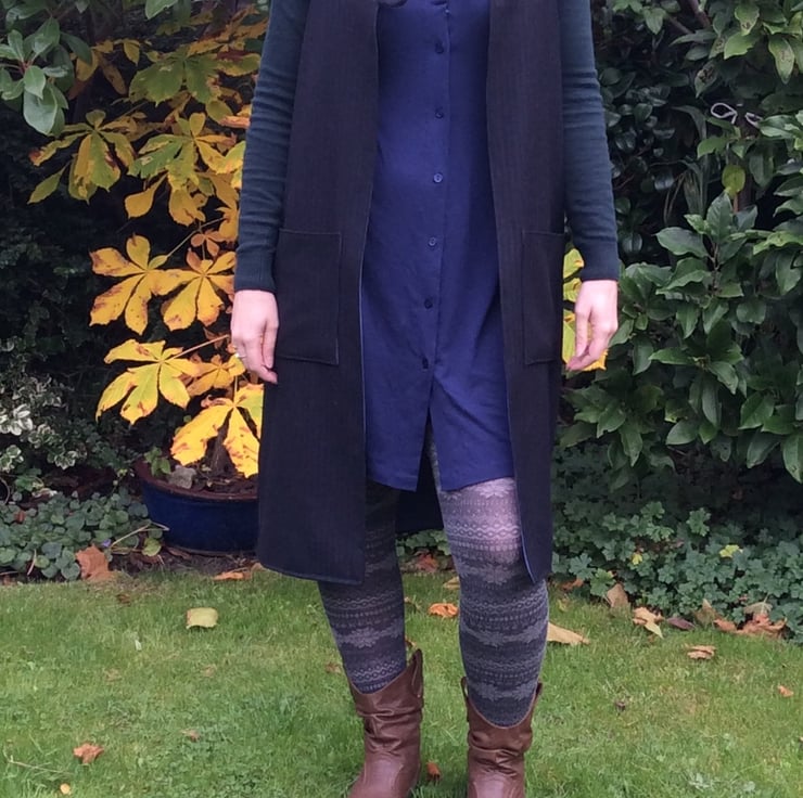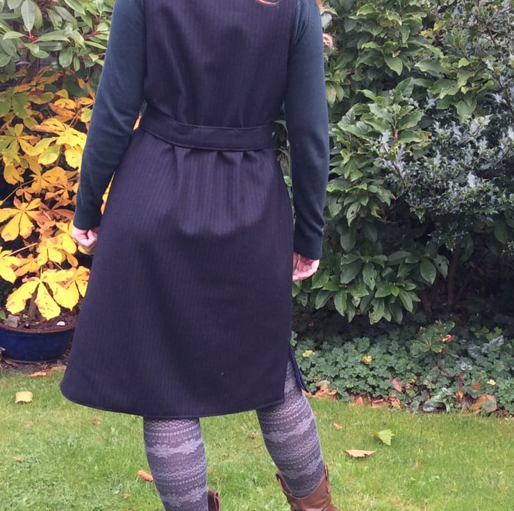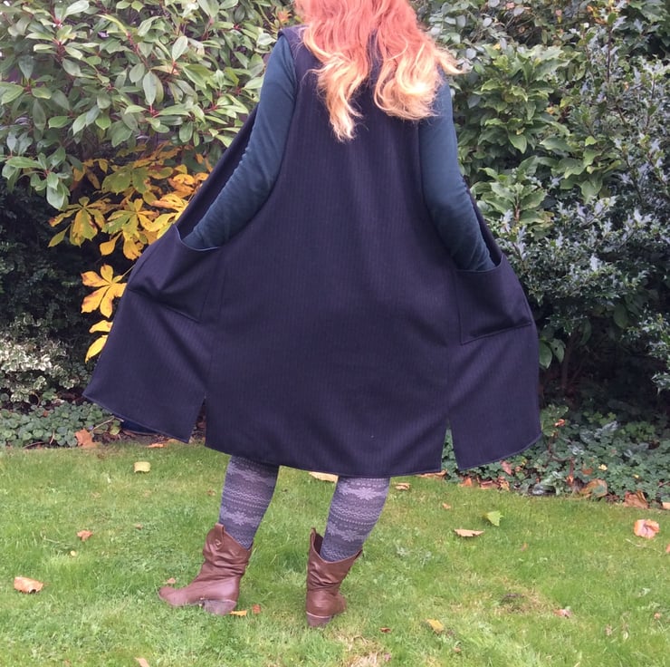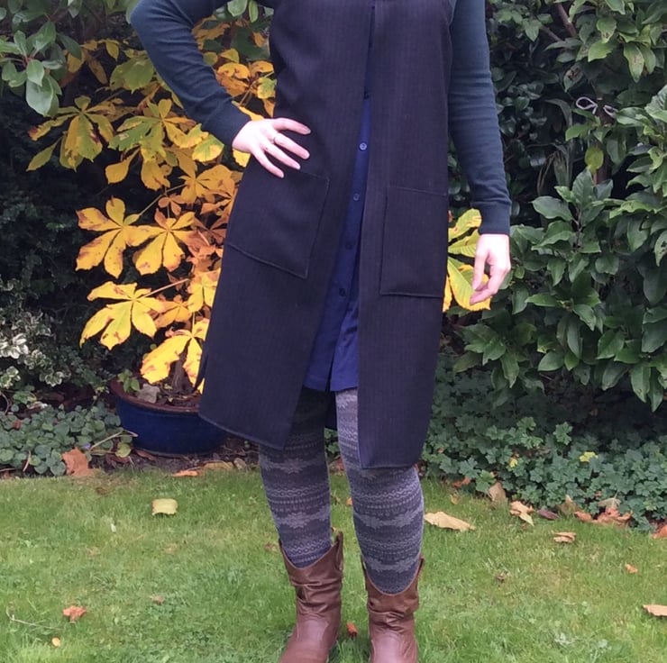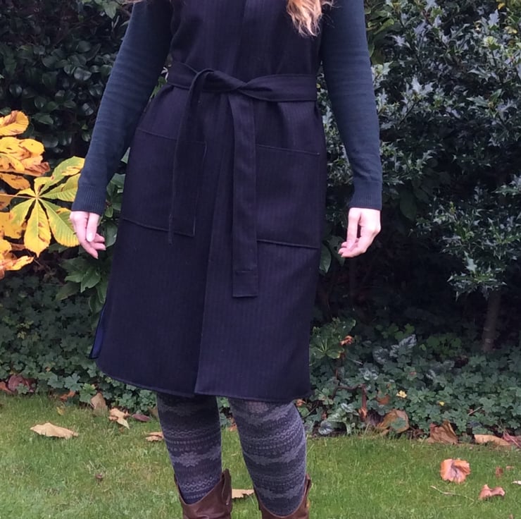 This on trend, longline, sleeveless, edge to edge coat is one of a kind and would be unique to you. It has simple elegant lines and is made from an attractive, very dark navy, pinstriped suiting fabric.The coat has a petrol blue lining, a button and fabric loop, two patch pockets, side vents at the hem and a matching, optional tie belt. It has generous arm holes to allow for layering cosy knitwear underneath.