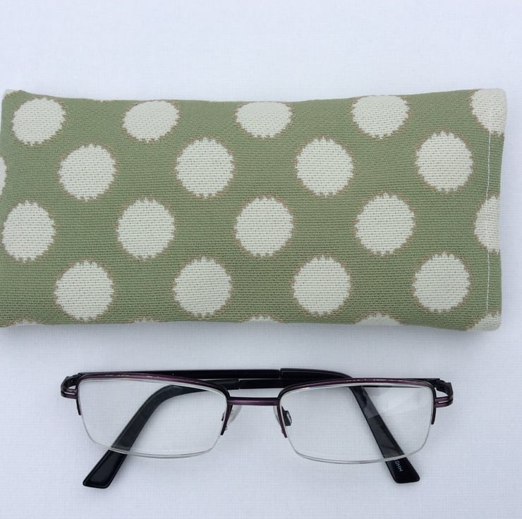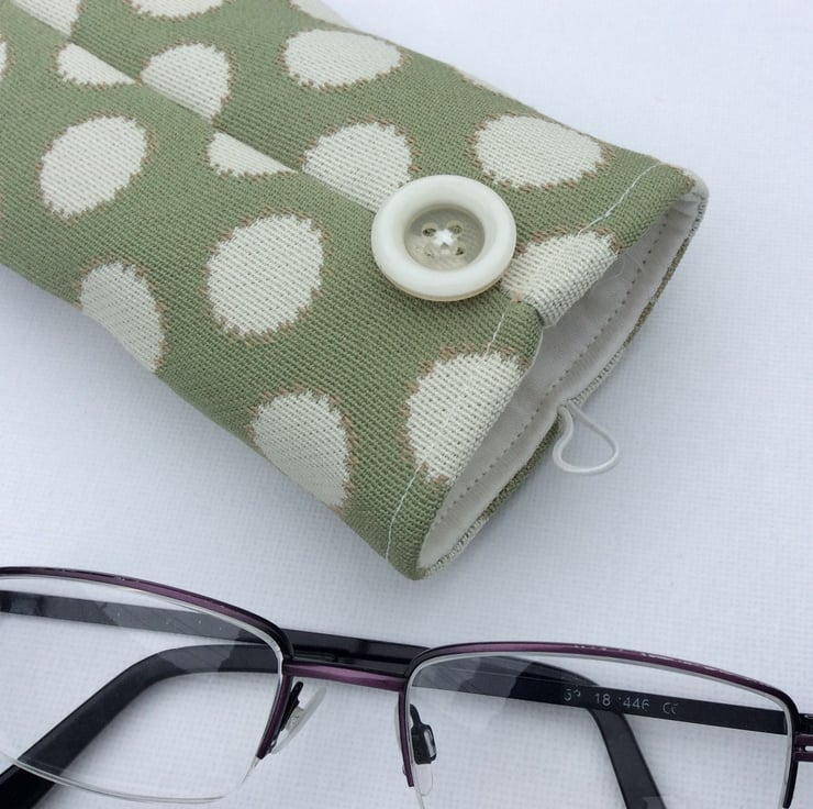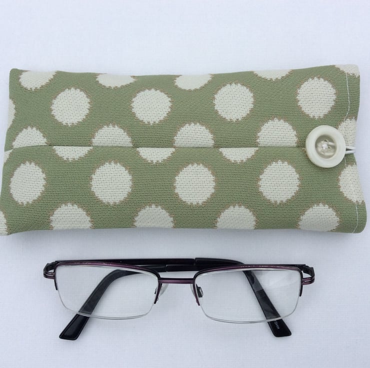 This sunglasses or glasses case is made from a sage green fabric with large cream spots.The lining is cream polyester cotton. The case is lightly padded and has a white elastic loop and cream and clear button closure. The case measures approximately 17cm x 8cm.