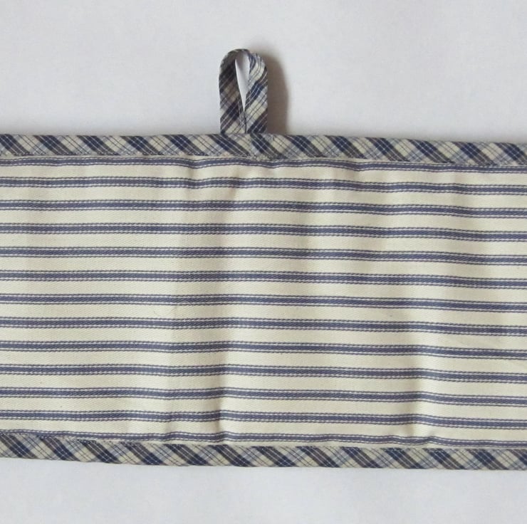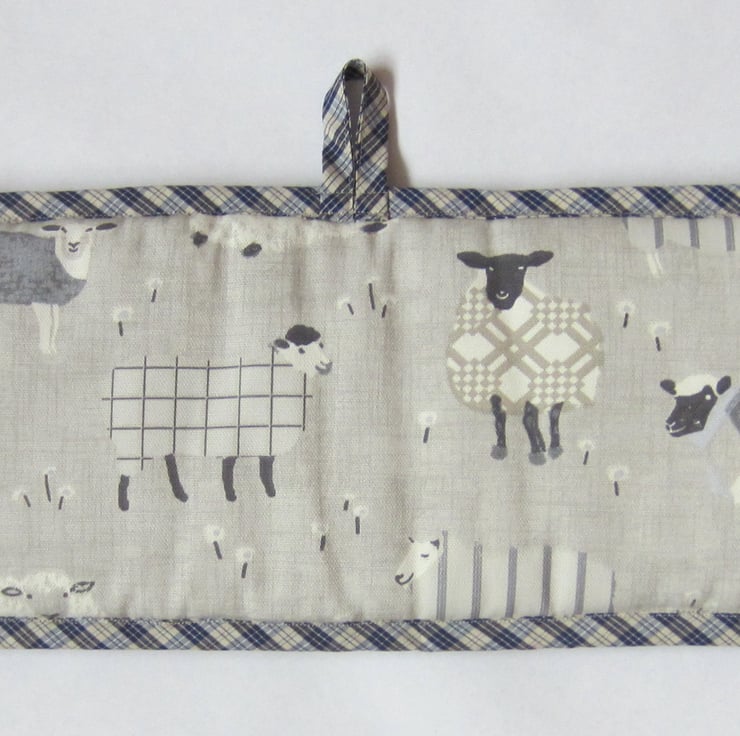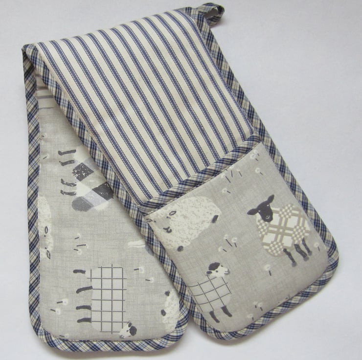 Thickly padded sheep oven gloves, backed with a dark blue and cream striped fabric and edged with a navy check.