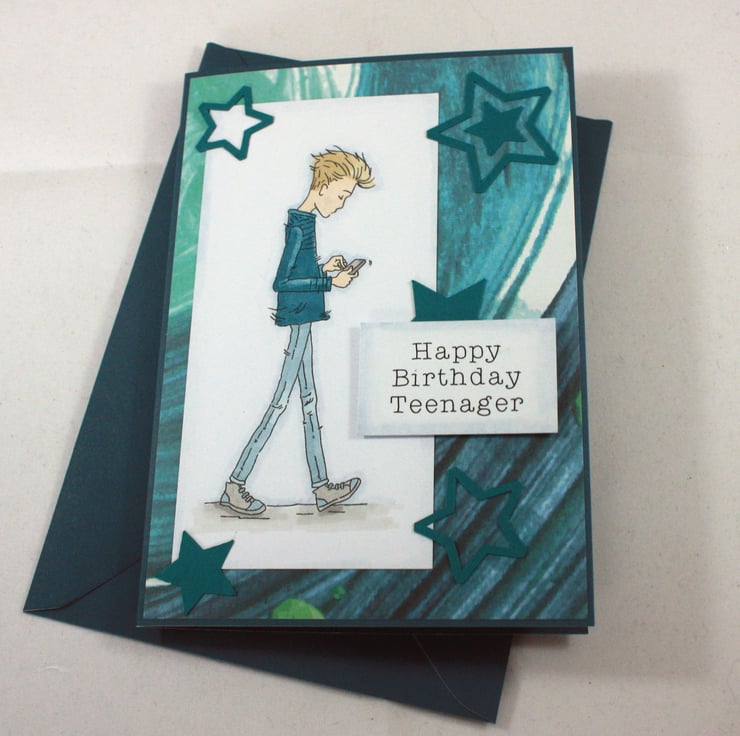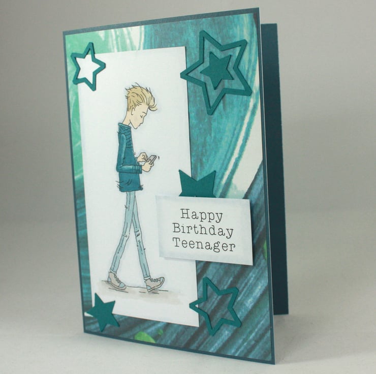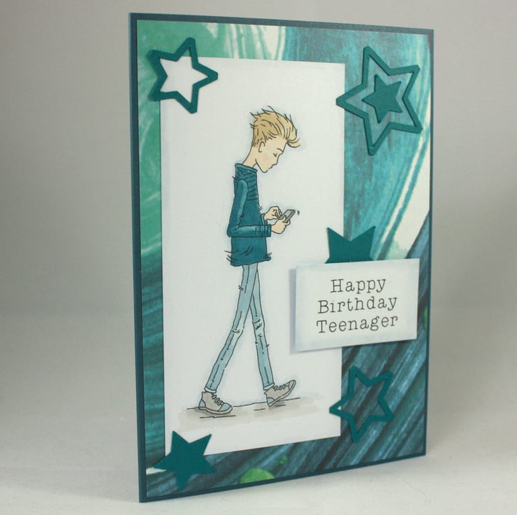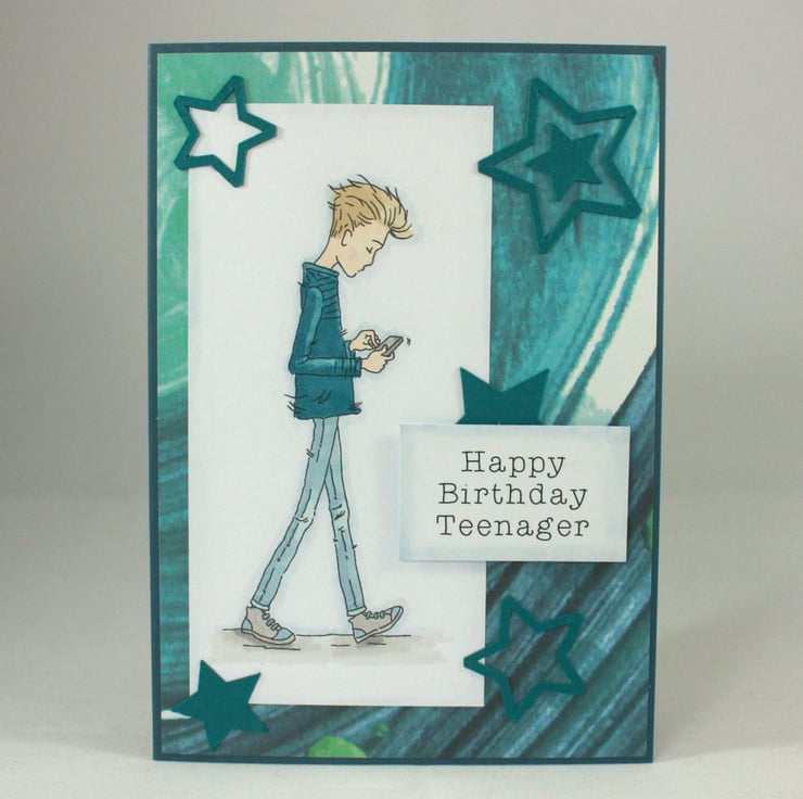A6 turquoise birthday card featuring an image of a teenage boy on his mobile phone. The image has been coloured using Promarkers and layered over a patterned background paper and embellished with stars cut from coordinating card, together with the printed message 'Happy Birthday Teenager'.