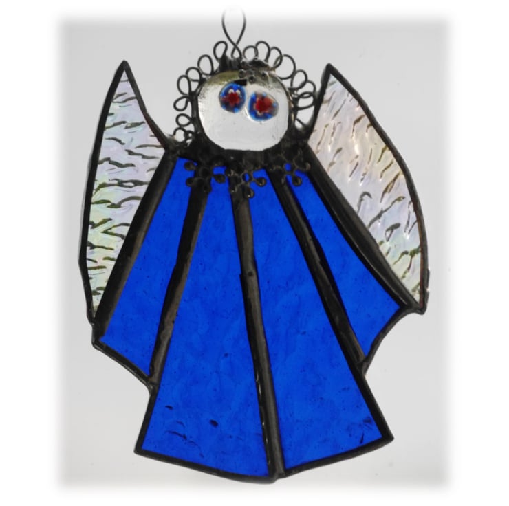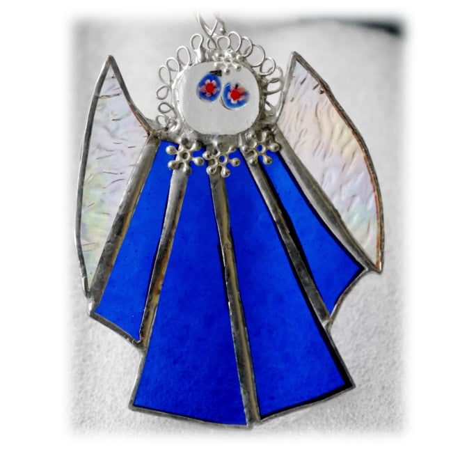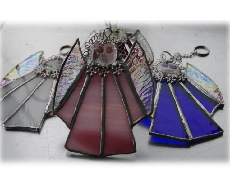 This is a stained glass suncatcher, an angel, made using the Tiffany copper foil technique.