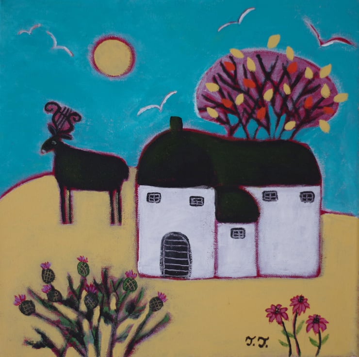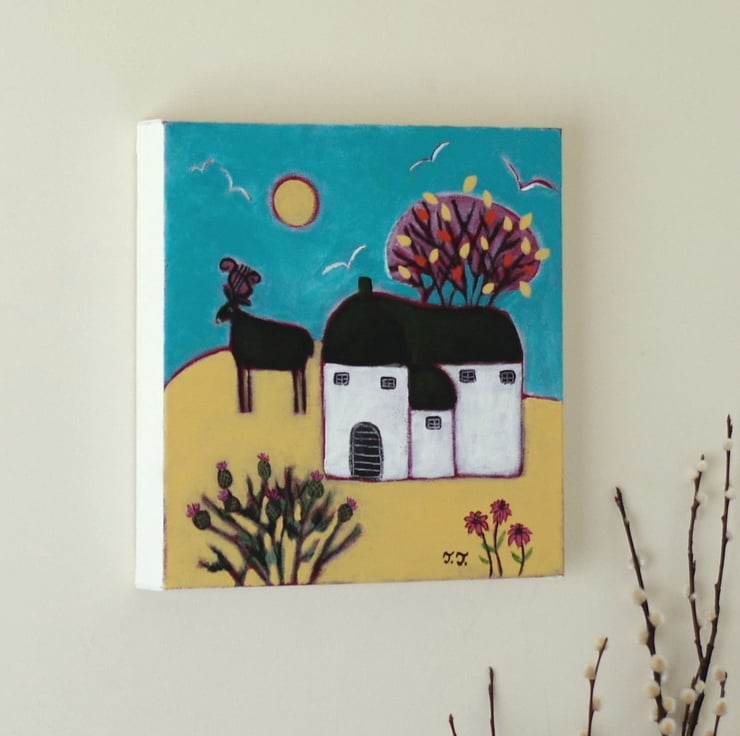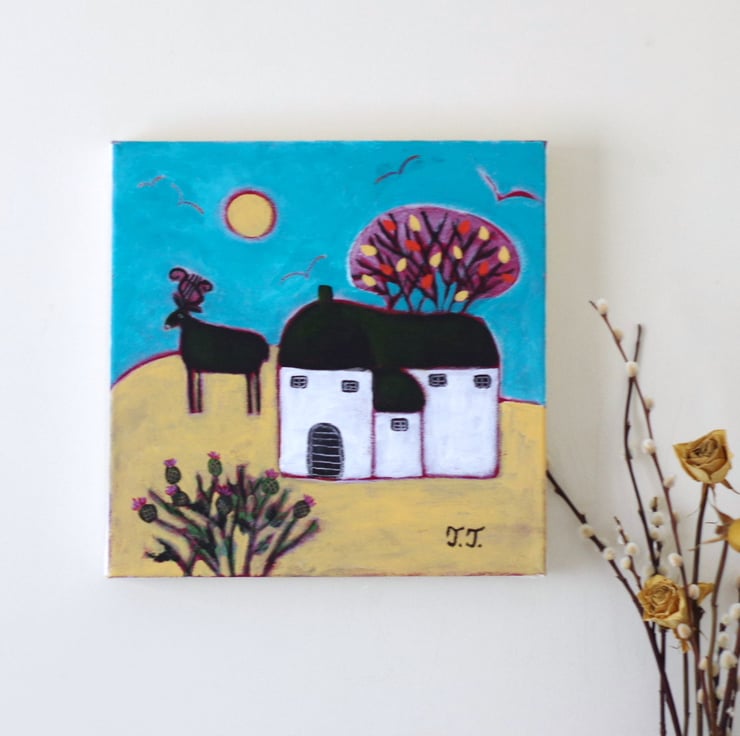 This is an original autumnal painting titled 'Autumn Cottage' inspired by Devon landscapes with its beautiful cottages. The painting is created in acrylic on canvas and it is ready to hang. The edges are painted in white so the artwork stands out beautifully. The landscape painting measures 12" x 12" x 1.5" and it comes with a Certificate of Authenticity.