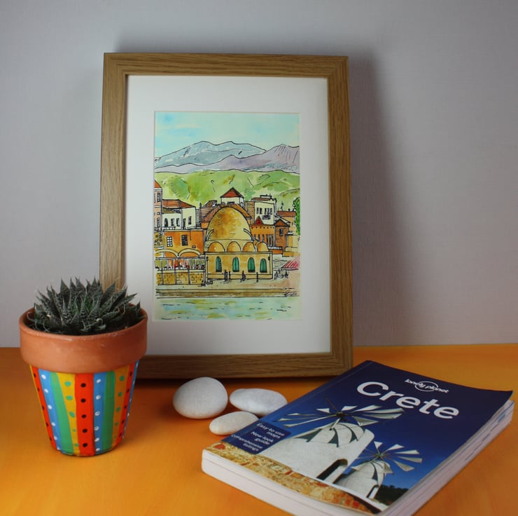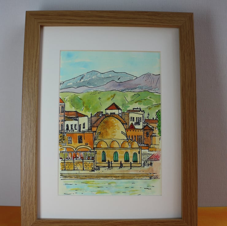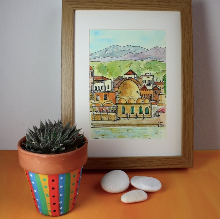 This giclee is a high quality print of my pen and watercolour drawing of a view of Chania from the sea looking towards the old mosque with the White Mountains in the background.