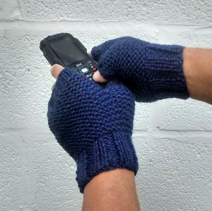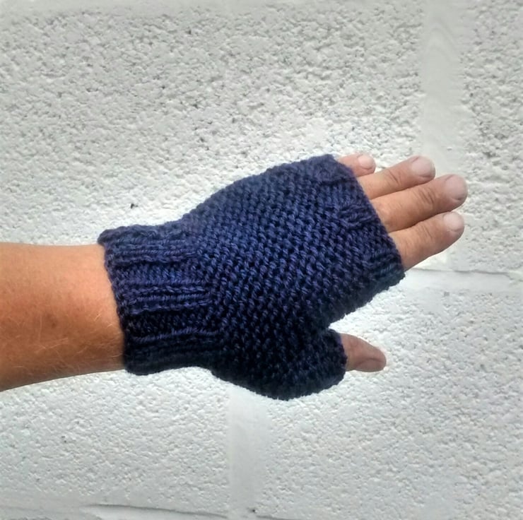 Dark blue hand knit fingerless gloves for men.